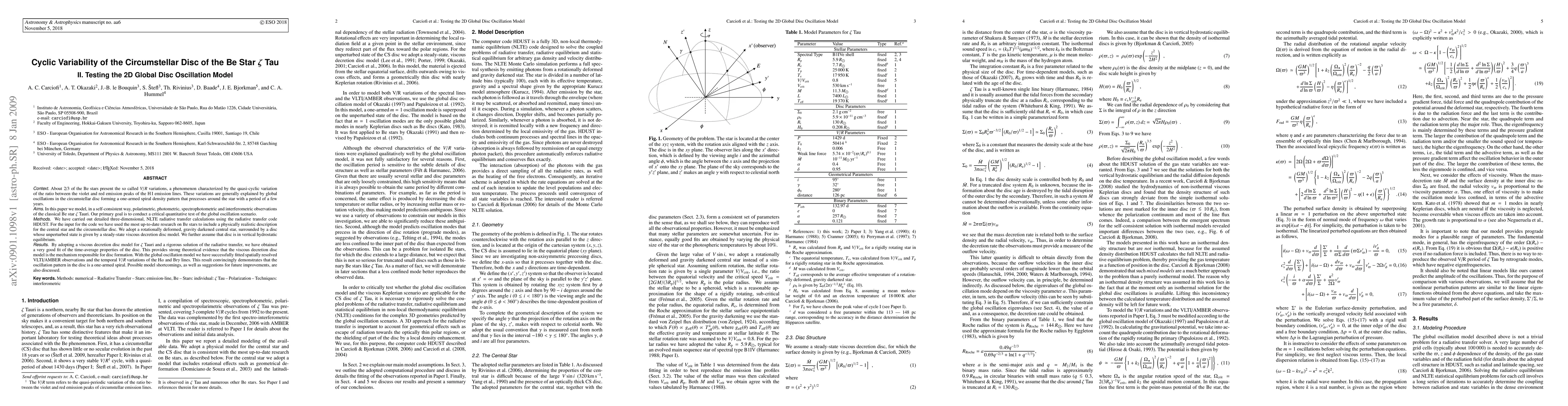 This study models observations of Be star Zeta Tau using 3D NLTE radiative transfer calculations, supporting the viscous decretion disc model for disc formation. The global oscillation model successfully fits VLTI/AMBER observations and Halpha/Brgamma line variations, confirming a one-armed spiral oscillation pattern in the disc.