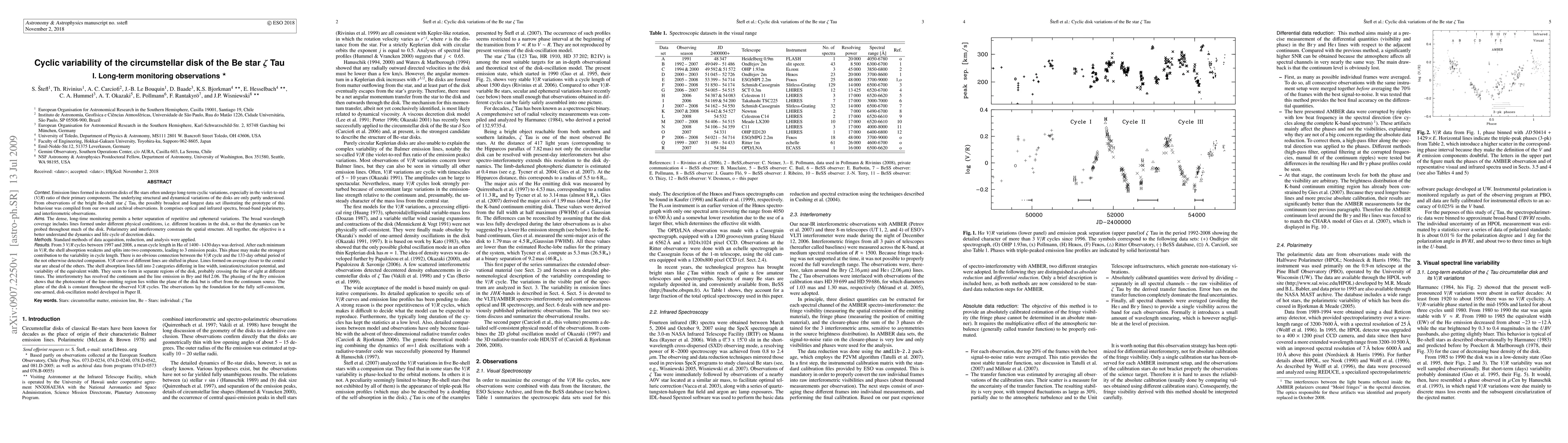 Emission lines formed in decretion disks of Be stars often undergo long-term cyclic variations, especially in the violet-to-red (V/R) ratio of their primary components. From observations of the bright Be-shell star zeta Tau, the possibly broadest and longest data set illustrating the prototype of this behaviour was compiled from our own and archival observations. It comprises optical and infrared spectra, broad-band polarimetry, and interferometric observations. From 3 V/R cycles between 1997 and 2008, a mean cycle length in H alpha of 1400-1430 days was derived. After each minimum in V/R, the shell absorption weakens and splits into two components, leading to 3 emission peaks. This phase makes the strongest contribution to the variability in cycle length. V/R curves of different lines are shifted in phase. Lines formed on average closer to the central star are ahead of the others. The shell absorption lines fall into 2 categories differing in line width, ionization/excitation potential, and variability of the equivalent width. The interferometry has resolved the continuum and the line emission in Br gamma and He I 2.06. The phasing of the Br gamma emission shows that the photocenter of the line-emitting region lies within the plane of the disk but is offset from the continuum source. The plane of the disk is constant throughout the observed V/R cycles. The self-consistent, one-armed, disk-oscillation model is developed in Paper II.