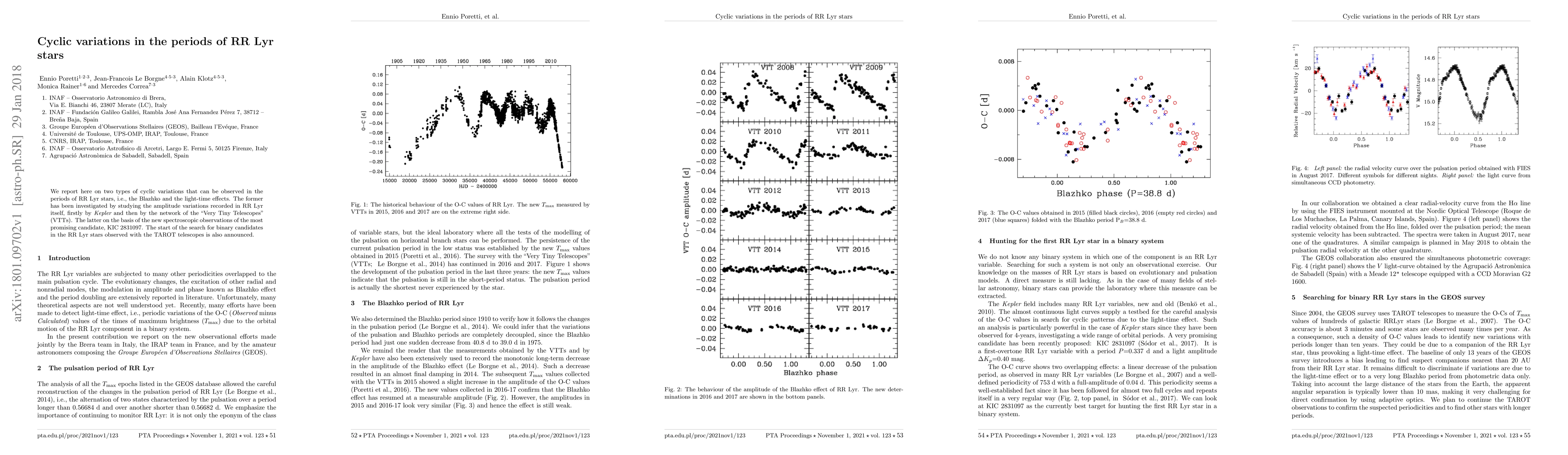 We report here on two types of cyclic variations that can be observed in the periods of RR Lyr stars, i.e., the Blazhko and the light-time effects. The former has been investigated by studying the amplitude variations recorded in RR Lyr itself, firstly by Kepler and then by the network of the "Very Tiny Telescopes" (VTTs). The latter on the basis of the new spectroscopic observations of the most promising candidate, KIC 2831097. The start of the search for binary candidates in the RR Lyr stars observed with the TAROT telescopes is also announced.