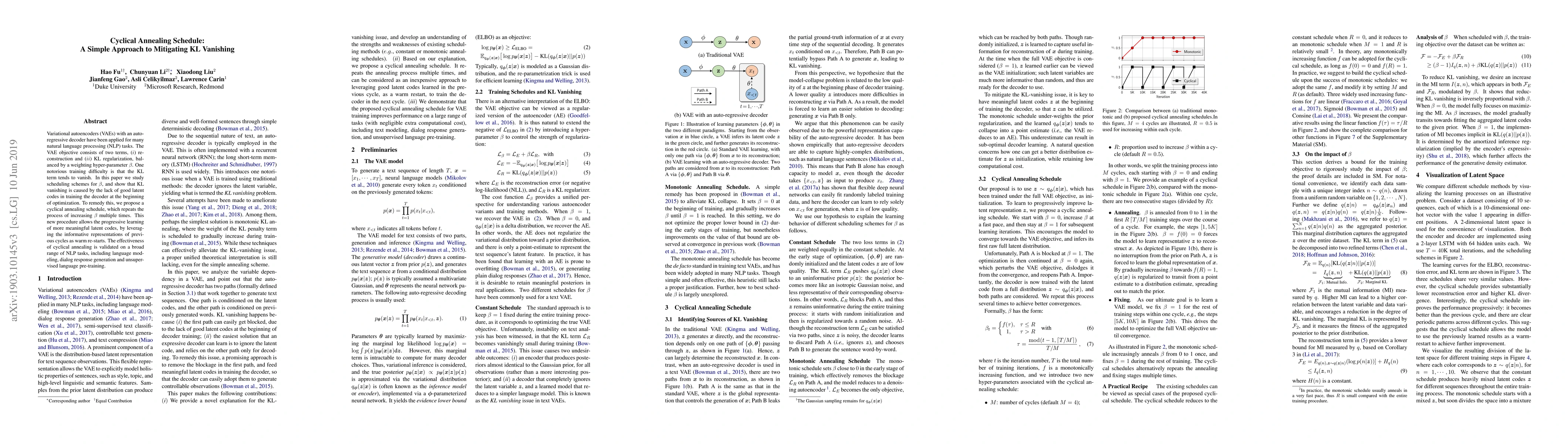 Variational autoencoders (VAEs) with an auto-regressive decoder have been applied for many natural language processing (NLP) tasks. The VAE objective consists of two terms, (i) reconstruction and (ii) KL regularization, balanced by a weighting hyper-parameter \beta. One notorious training difficulty is that the KL term tends to vanish. In this paper we study scheduling schemes for \beta, and show that KL vanishing is caused by the lack of good latent codes in training the decoder at the beginning of optimization. To remedy this, we propose a cyclical annealing schedule, which repeats the process of increasing \beta multiple times. This new procedure allows the progressive learning of more meaningful latent codes, by leveraging the informative representations of previous cycles as warm re-starts. The effectiveness of cyclical annealing is validated on a broad range of NLP tasks, including language modeling, dialog response generation and unsupervised language pre-training.