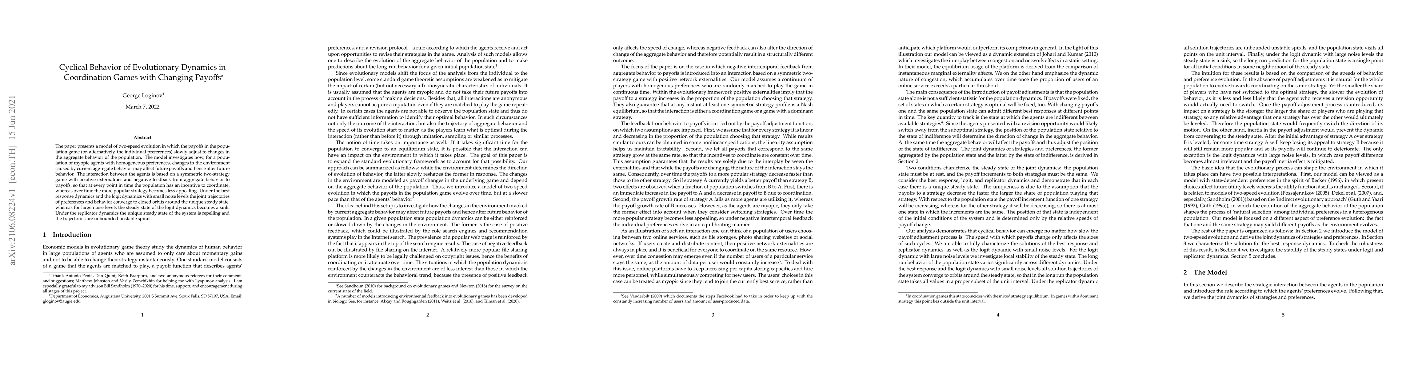 The paper presents a model of two-speed evolution in which the payoffs in the population game (or, alternatively, the individual preferences) slowly adjust to changes in the aggregate behavior of the population. The model investigates how, for a population of myopic agents with homogeneous preferences, changes in the environment caused by current aggregate behavior may affect future payoffs and hence alter future behavior. The interaction between the agents is based on a symmetric two-strategy game with positive externalities and negative feedback from aggregate behavior to payoffs, so that at every point in time the population has an incentive to coordinate, whereas over time the more popular strategy becomes less appealing. Under the best response dynamics and the logit dynamics with small noise levels the joint trajectories of preferences and behavior converge to closed orbits around the unique steady state, whereas for large noise levels the steady state of the logit dynamics becomes a sink. Under the replicator dynamics the unique steady state of the system is repelling and the trajectories are unbounded unstable spirals.