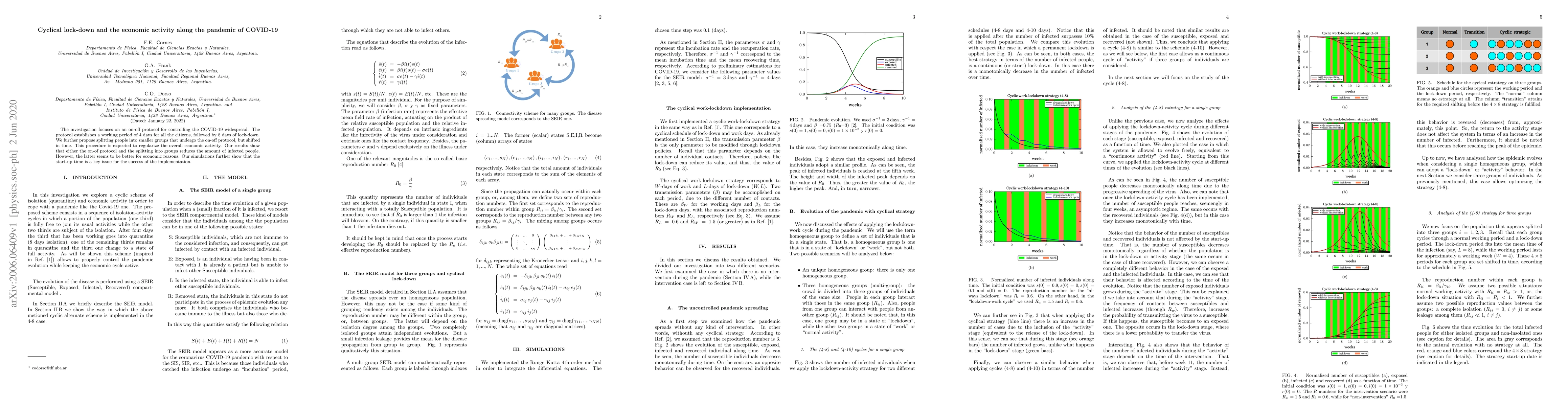 The investigation focuses on an on-off protocol for controlling the COVID-19 widespread. The protocol establishes a working period of 4 days for all the citizens, followed by 8 days of lock-down. We further propose splitting people into smaller groups that undergo the on-off protocol, but shifted in time. This procedure is expected to regularize the overall economic activity. Our results show that either the on-of protocol and the splitting into groups reduces the amount of infected people. However, the latter seems to be better for economic reasons. Our simulations further show that the start-up time is a key issue for the success of the implementation.