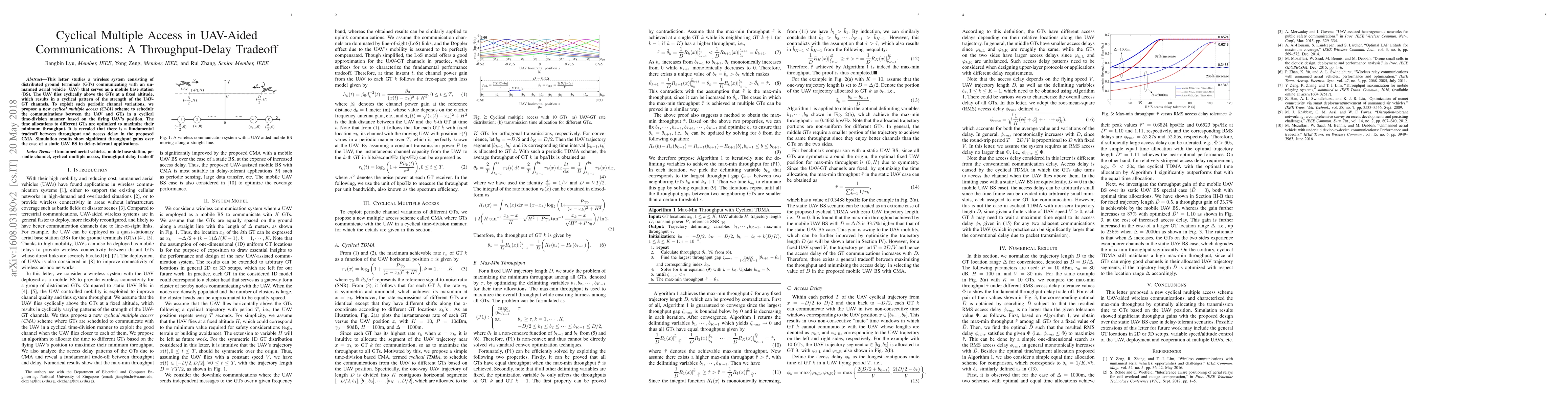 This paper proposes a cyclical multiple access (CMA) scheme for UAV-aided communications to optimize throughput based on the UAV's periodic flight pattern, revealing a tradeoff between throughput and access delay, with significant gains over static base stations in delay-tolerant applications.