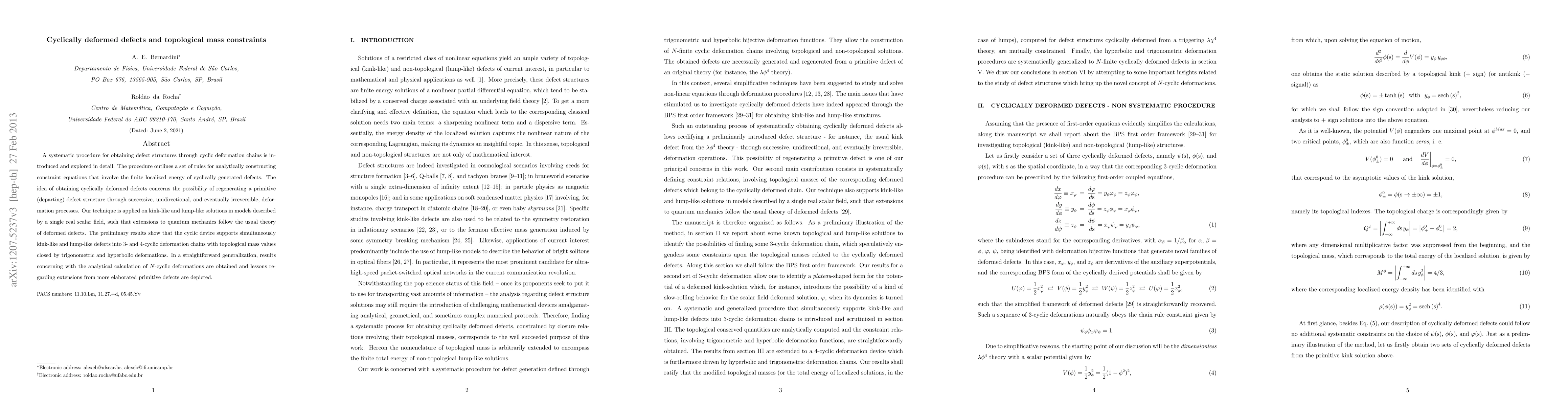 This paper introduces a systematic method for generating defect structures via cyclic deformation processes, focusing on analytically constructing constraint equations for the finite localized energy of these defects. The technique is demonstrated through kink-like and lump-like solutions in scalar field models, showing the potential for extending to quantum mechanics and revealing topological mass constraints in cyclic deformations.