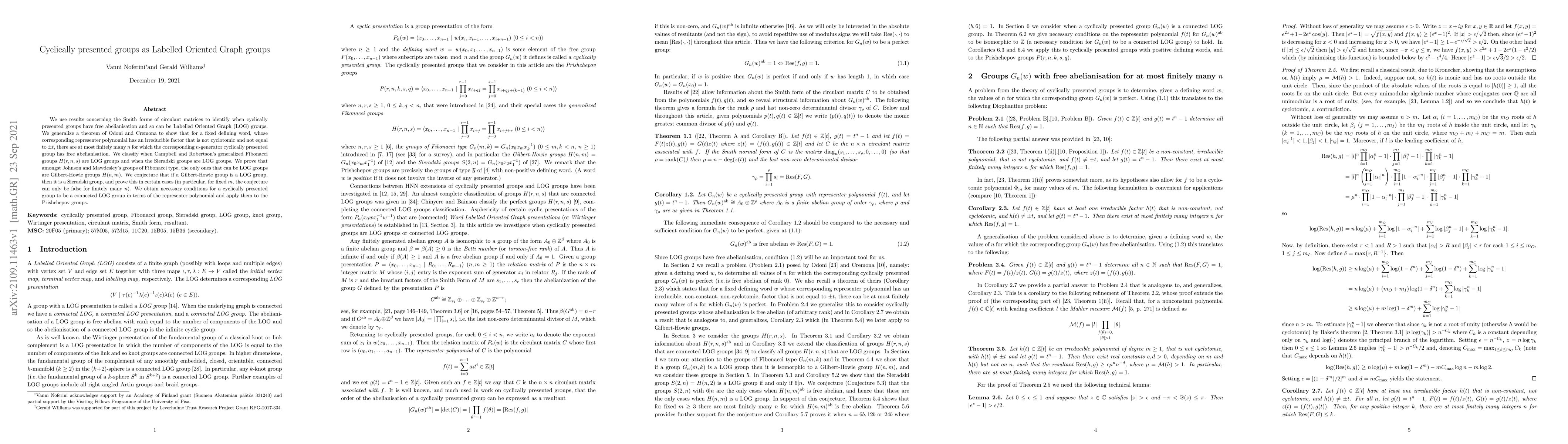 This paper identifies conditions under which cyclically presented groups have free abelianisation and can be Labelled Oriented Graph (LOG) groups, generalizing prior theorems and classifying specific groups like generalized Fibonacci and Sieradski groups as LOG or not. It also conjectures and partially proves that Gilbert-Howie groups, if LOG, are Sieradski groups, and provides necessary conditions for LOG classification.
