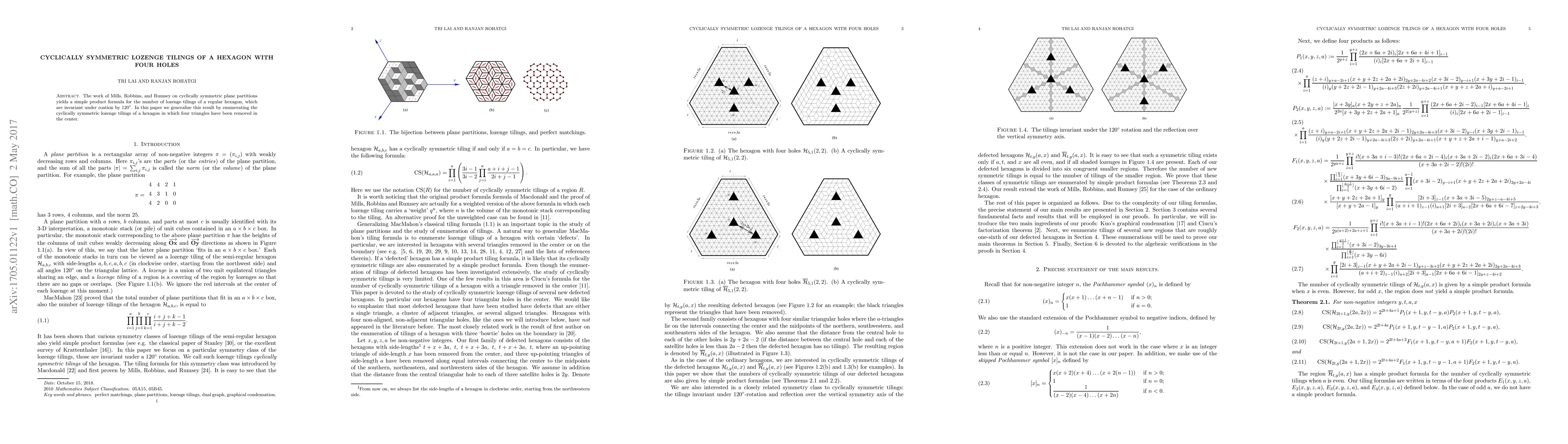 This paper generalizes the product formula for counting cyclically symmetric lozenge tilings of a regular hexagon to include cases where four central triangles are removed, extending previous work on hexagon tilings.