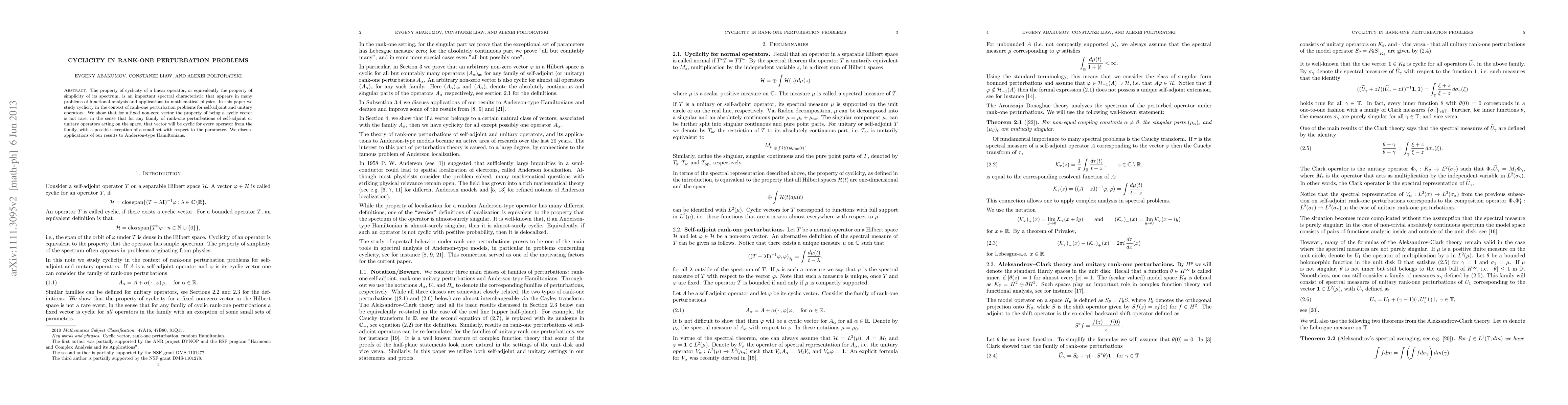 This paper explores cyclicity in rank-one perturbation problems of self-adjoint and unitary operators, demonstrating that for a fixed non-zero vector, being a cyclic vector is common, with exceptions only on a small parameter set. It also discusses applications to Anderson-type Hamiltonians.