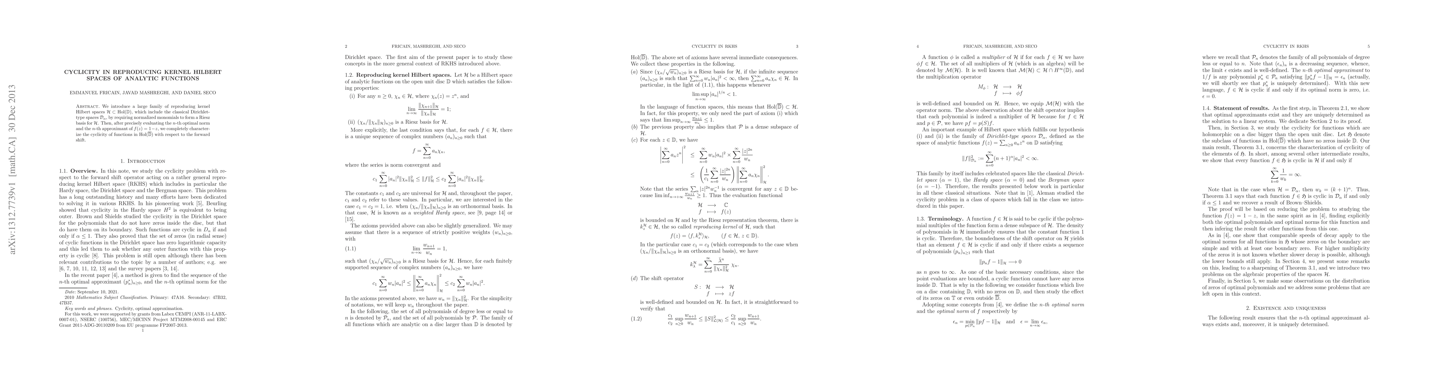 The paper introduces reproducing kernel Hilbert spaces (RKHS) of analytic functions, characterizing cyclicity with respect to the forward shift operator, and evaluates optimal norms and approximants for the function f(z) = 1 - z.