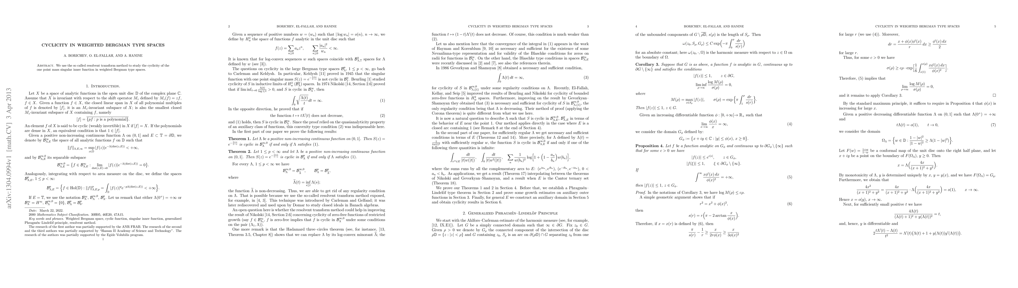 Summary: This paper investigates the cyclicity of a one point mass singular inner function in weighted Bergman type spaces using the resolvent transform method. The study reveals insights into the structure and properties of these function spaces.