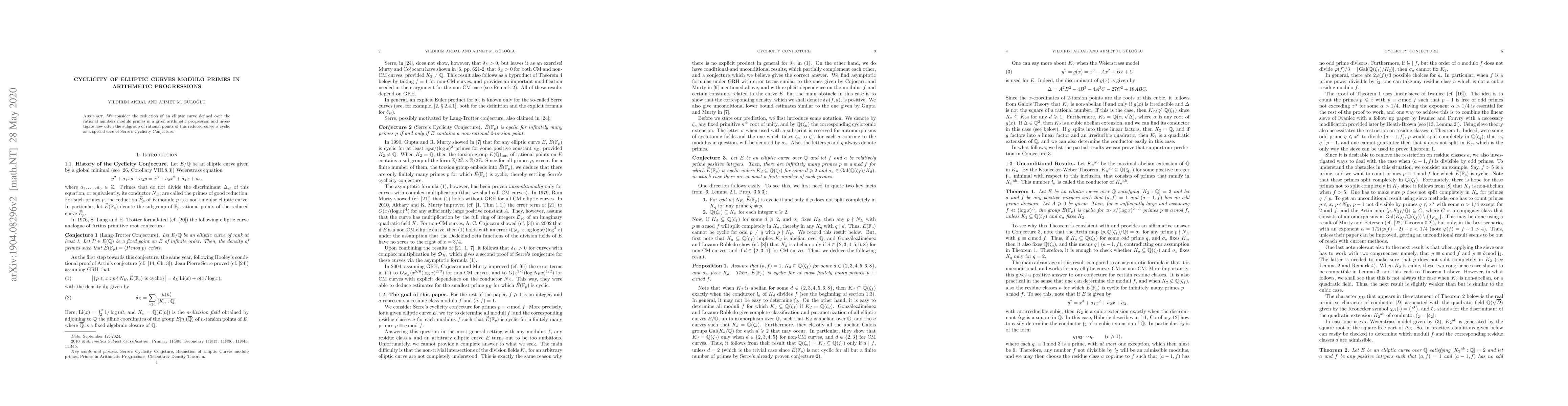 This paper examines the cyclicity of elliptic curves modulo primes in specific arithmetic progressions, focusing on the frequency of cyclic subgroups in reduced curves as a special case of Serre's Cyclicity Conjecture.