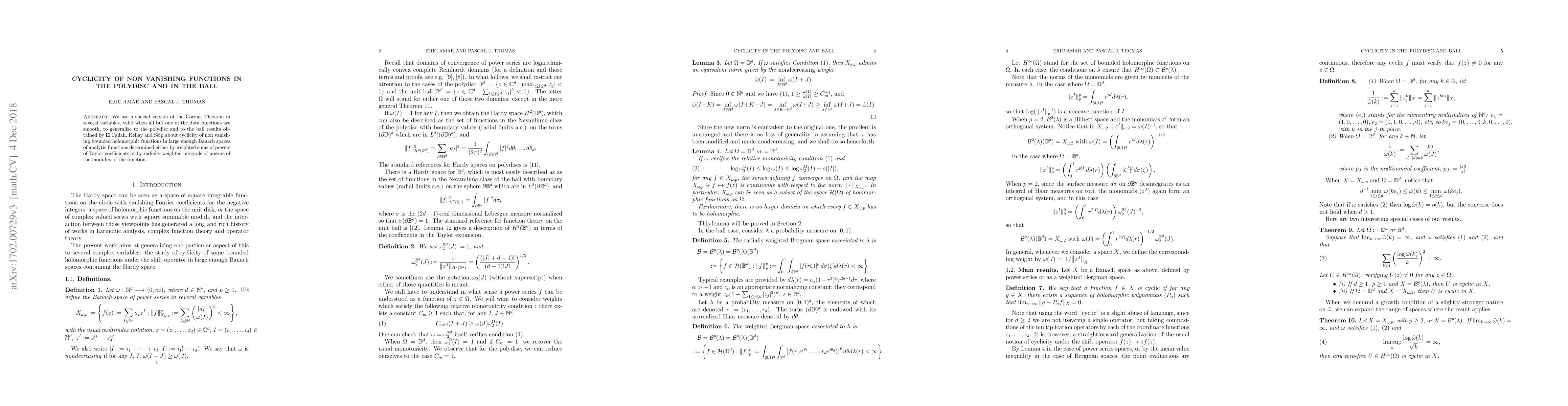 This paper generalizes results on cyclicity of non-vanishing functions in polydiscs and balls using a special version of the Corona Theorem. It establishes new connections between functions in Banach spaces determined by Taylor coefficients or modulus integrals.