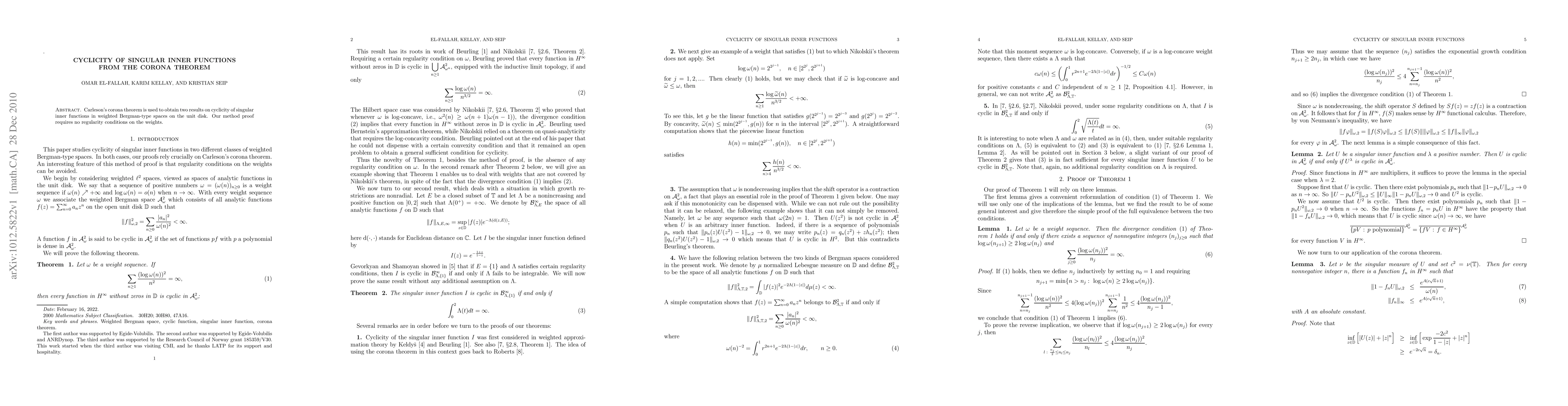 Summary: This paper uses Carleson's corona theorem to establish results on the cyclicity of singular inner functions in weighted Bergman-type spaces, without requiring any regularity conditions on the weights. The method employed in the proof is novel and effective.