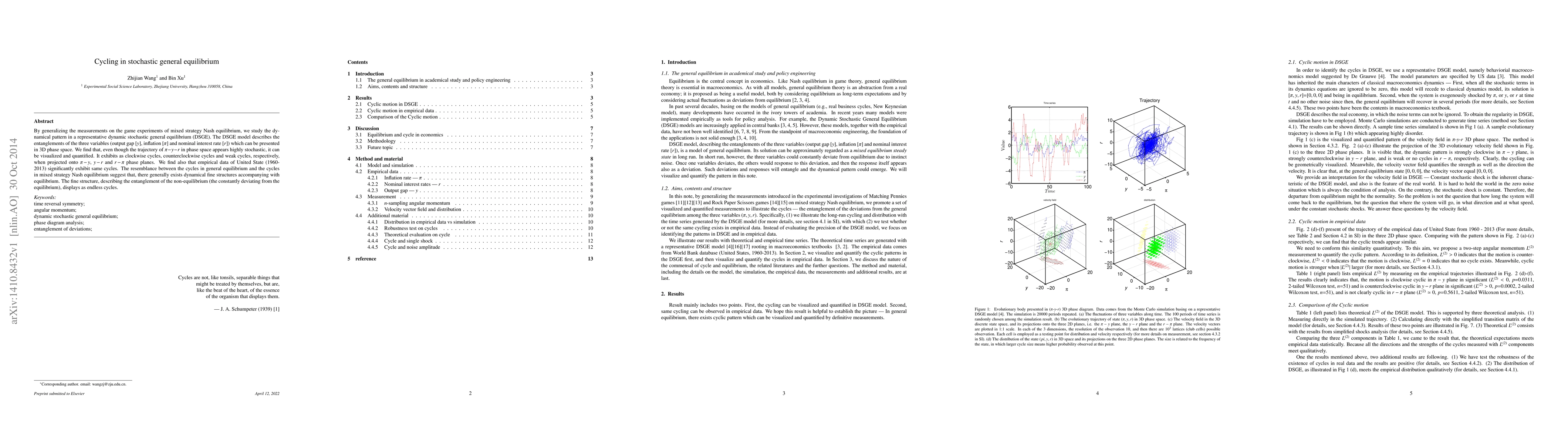 This research identifies cyclical patterns in dynamic stochastic general equilibrium (DSGE) models, visualizing trajectories of output gap, inflation, and interest rate in 3D phase space. The study finds clockwise, counterclockwise, and weak cycles when projected onto different phase planes, mirroring cycles in mixed strategy Nash equilibrium games. Empirical US economic data (1960-2013) show similar cycles, suggesting constant non-equilibrium deviations forming endless cycles, revealing fine dynamical structures in equilibrium.