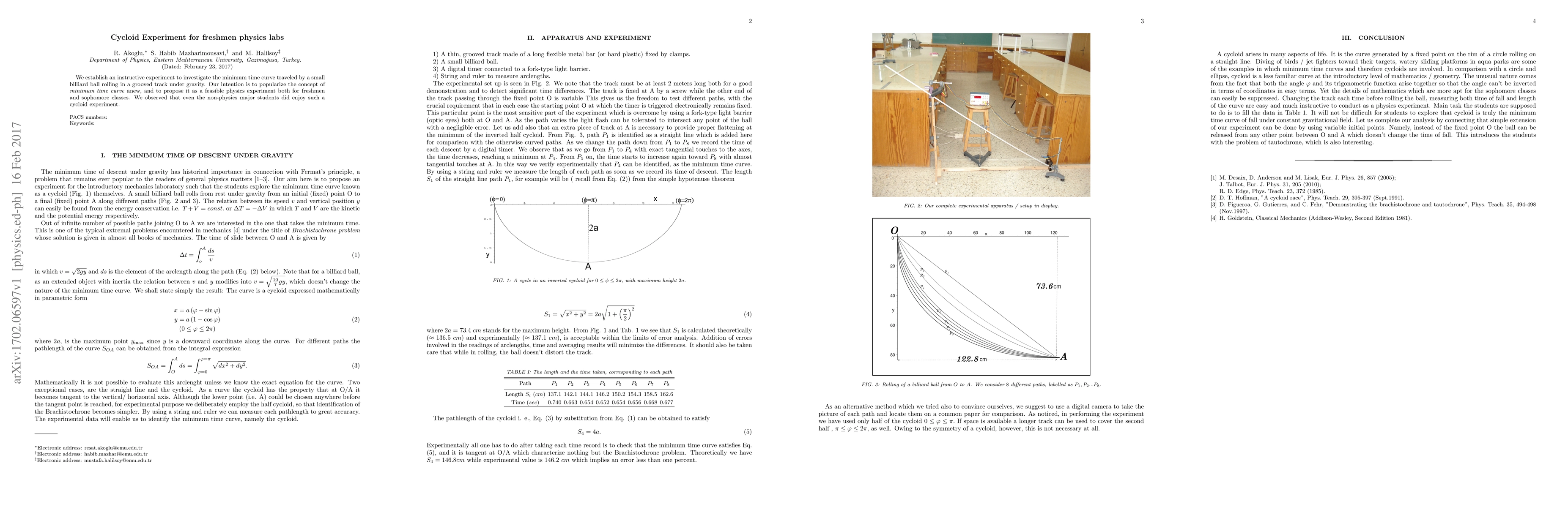 We establish an instructive experiment to investigate the minimum time curve traveled by a small billiard ball rolling in a grooved track under gravity. Our intention is to popularize the concept of \textit{minimum time curve} anew, and to propose it as a feasible physics experiment both for freshmen and sophomore classes. We observed that even the non-physics major students did enjoy such a cycloid experiment.