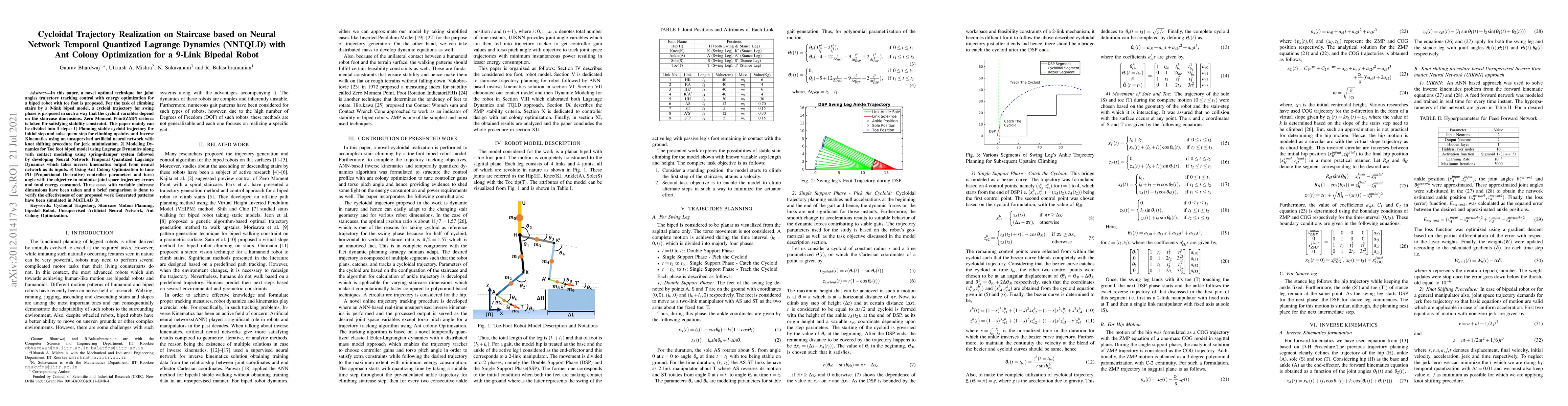 This paper proposes a novel optimal control technique for a 9-link biped robot's joint angles trajectory tracking with energy optimization, utilizing a cycloid trajectory for stair climbing. The approach integrates neural networks, temporal quantized Lagrange dynamics, and ant colony optimization to minimize errors and energy consumption, validated through simulations in MATLAB.