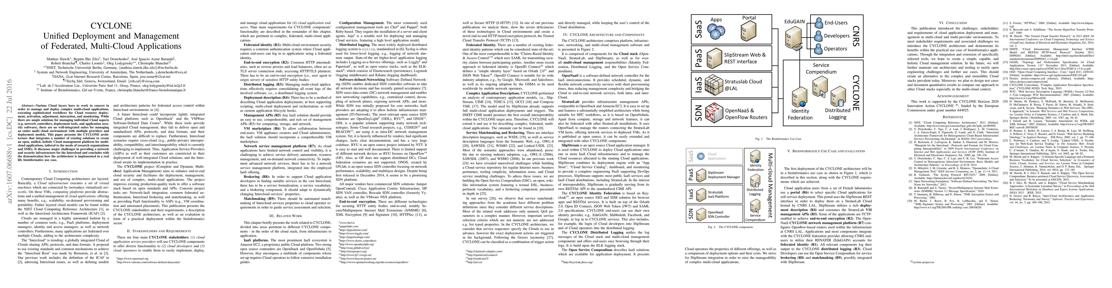 Various Cloud layers have to work in concert in order to manage and deploy complex multi-cloud applications, executing sophisticated workflows for Cloud resource deployment, activation, adjustment, interaction, and monitoring. While there are ample solutions for managing individual Cloud aspects (e.g. network controllers, deployment tools, and application security software), there are no well-integrated suites for managing an entire multi cloud environment with multiple providers and deployment models. This paper presents the CYCLONE architecture that integrates a number of existing solutions to create an open, unified, holistic Cloud management platform for multi-cloud applications, tailored to the needs of research organizations and SMEs. It discusses major challenges in providing a network and security infrastructure for the Intercloud and concludes with the demonstration how the architecture is implemented in a real life bioinformatics use case.