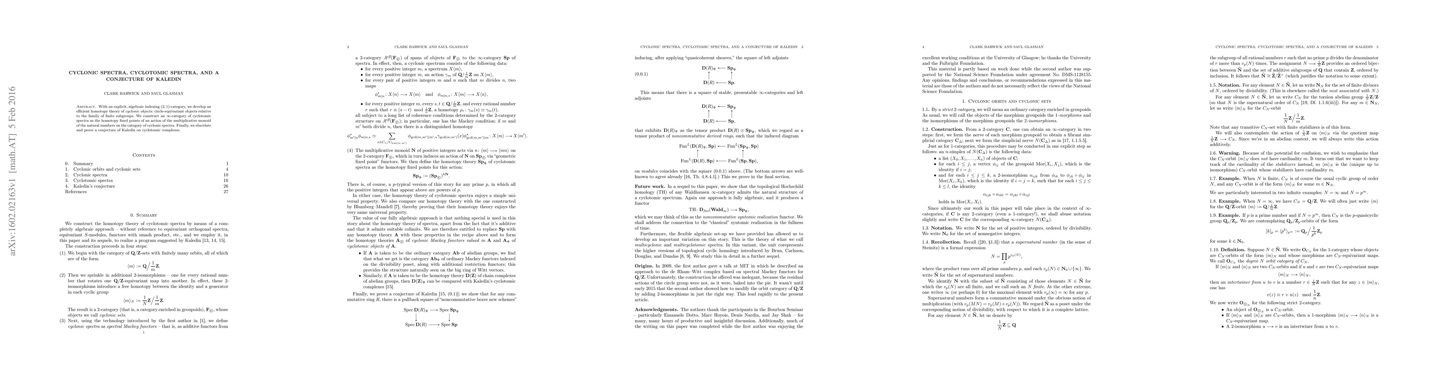 This paper develops a homotopy theory for cyclonic objects using an algebraic indexing $(2,1)$-category and constructs an $\infty$-category of cyclotomic spectra. It also proves Kaledin's conjecture regarding cyclotomic complexes.