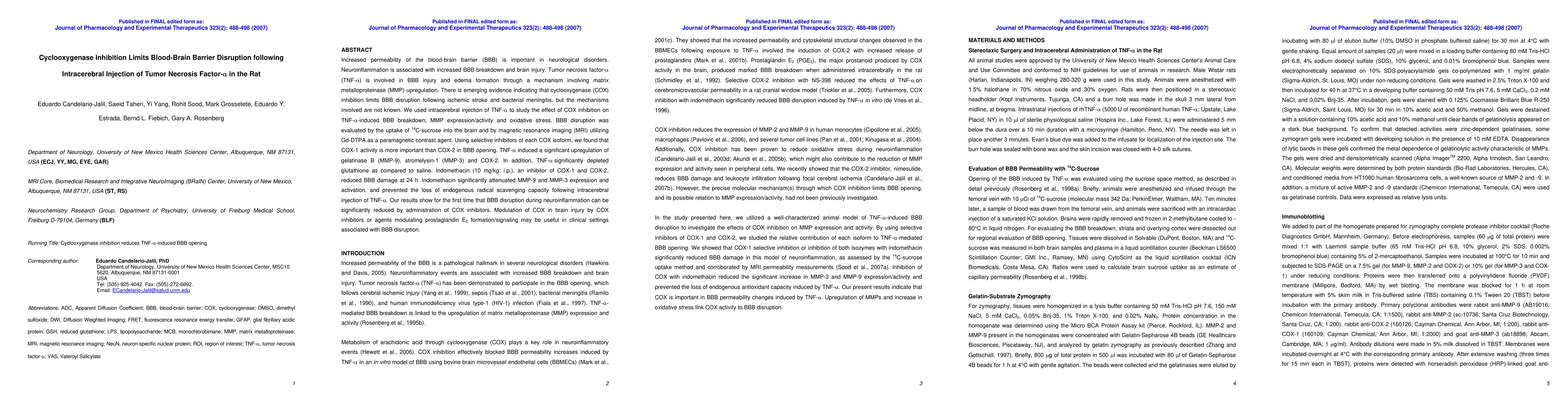 This study demonstrates that cyclooxygenase (COX) inhibition, particularly COX-1, limits blood-brain barrier (BBB) disruption induced by tumor necrosis factor-alpha (TNF-a) in rats. COX inhibitors reduced TNF-a-induced upregulation of matrix metalloproteinases and oxidative stress, suggesting a potential therapeutic approach for neuroinflammation-related BBB breakdown.