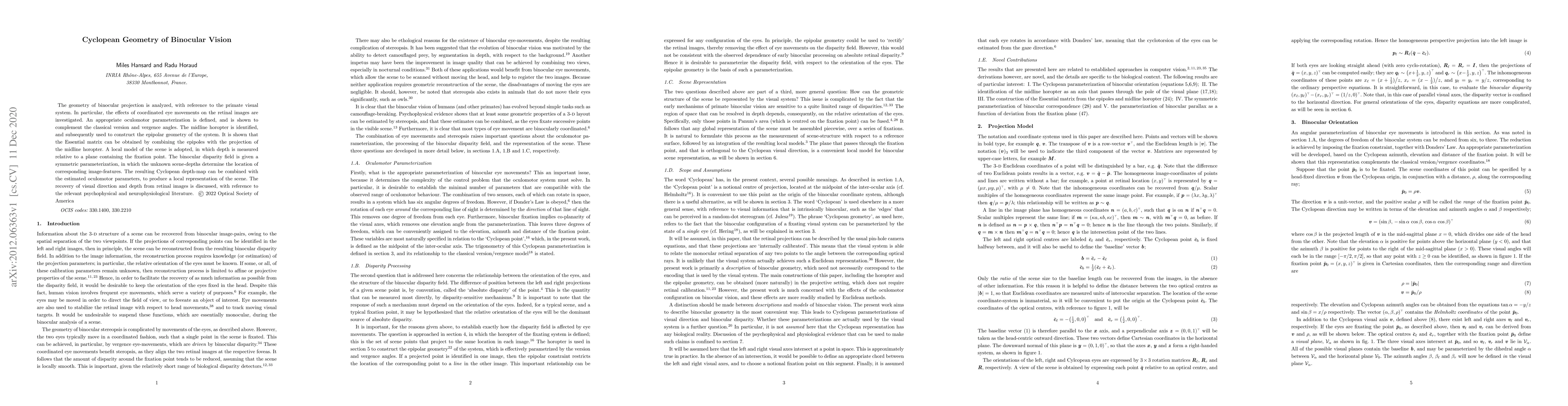 The geometry of binocular projection is analyzed, with reference to the primate visual system. In particular, the effects of coordinated eye movements on the retinal images are investigated. An appropriate oculomotor parameterization is defined, and is shown to complement the classical version and vergence angles. The midline horopter is identified, and subsequently used to construct the epipolar geometry of the system. It is shown that the Essential matrix can be obtained by combining the epipoles with the projection of the midline horopter. A local model of the scene is adopted, in which depth is measured relative to a plane containing the fixation point. The binocular disparity field is given a symmetric parameterization, in which the unknown scene-depths determine the location of corresponding image-features. The resulting Cyclopean depth-map can be combined with the estimated oculomotor parameters, to produce a local representation of the scene. The recovery of visual direction and depth from retinal images is discussed, with reference to the relevant psychophysical and neurophysiological literature.