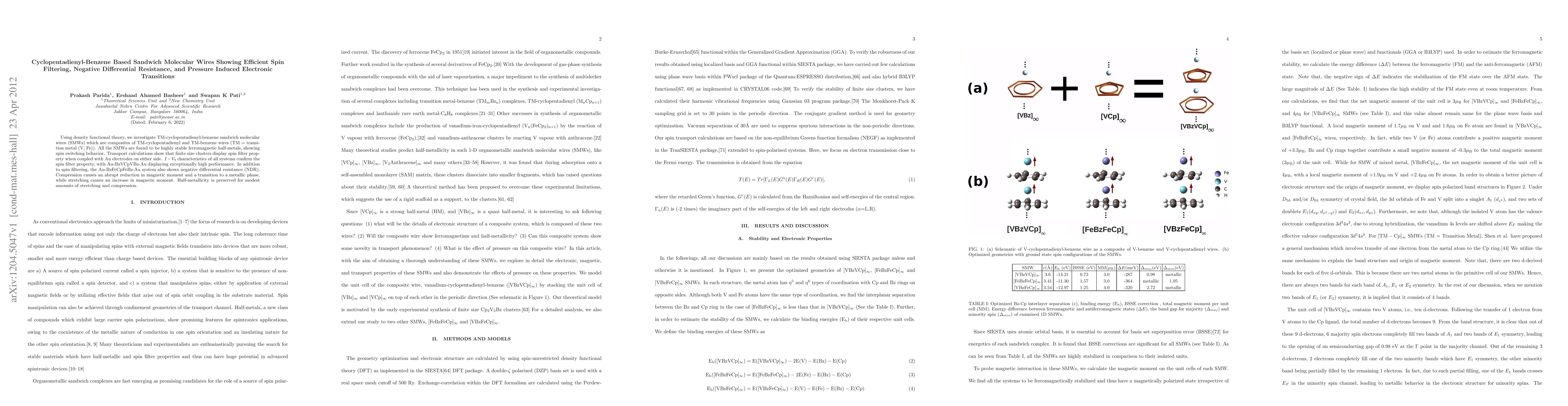 This study uses density functional theory to explore TM-cyclopentadienyl-benzene sandwich molecular wires, revealing their stability and ferromagnetic half-metallicity. The systems exhibit spin filtering and negative differential resistance, with pressure inducing electronic transitions and altering magnetic properties.