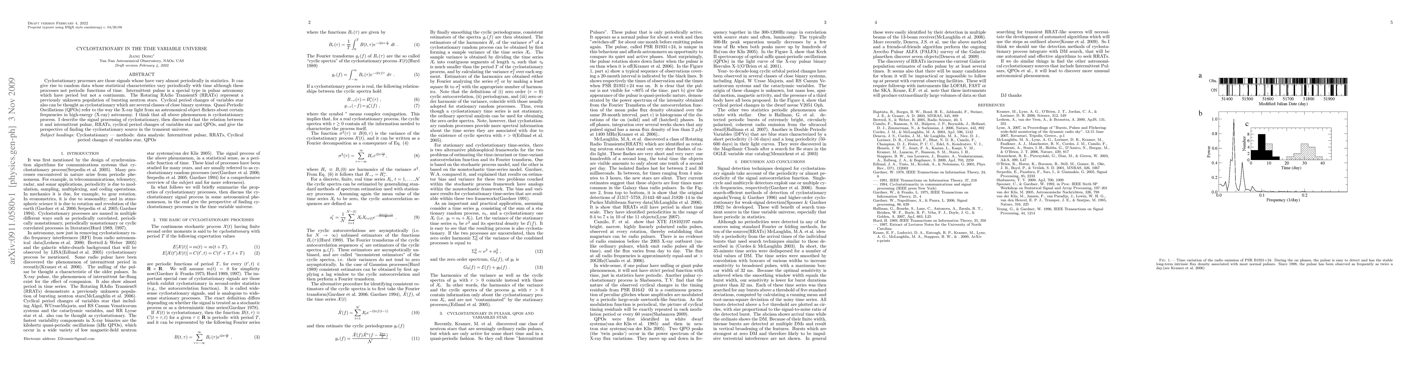 This paper explores cyclostationary processes in various astronomical phenomena, including pulsars, RRATs, and QPOs, highlighting their similarities with cyclical signals that vary periodically in statistics.