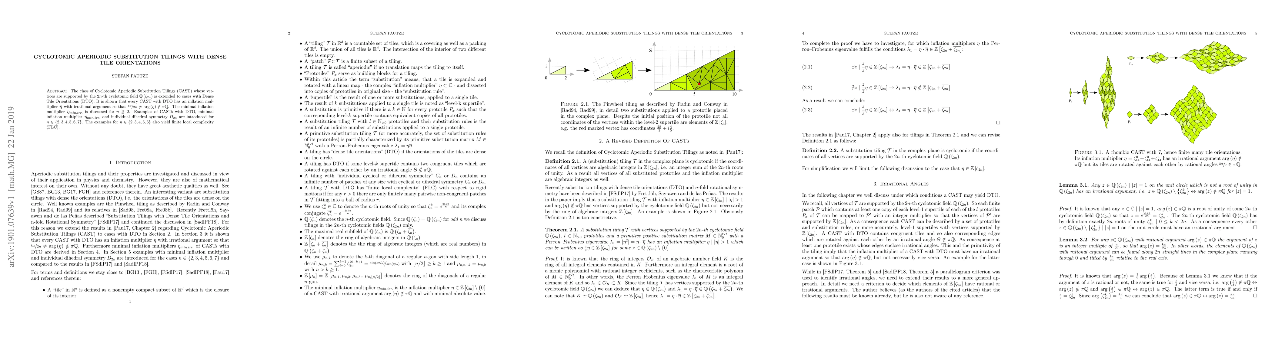 This paper extends Cyclotomic Aperiodic Substitution Tilings (CAST) to include Dense Tile Orientations (DTO) and demonstrates that their minimal inflation multipliers have irrational arguments. Examples of CASTs with DTO and minimal inflation multipliers are provided for $n=2$ to $7$, with finite local complexity for $n=2$ to $6$.