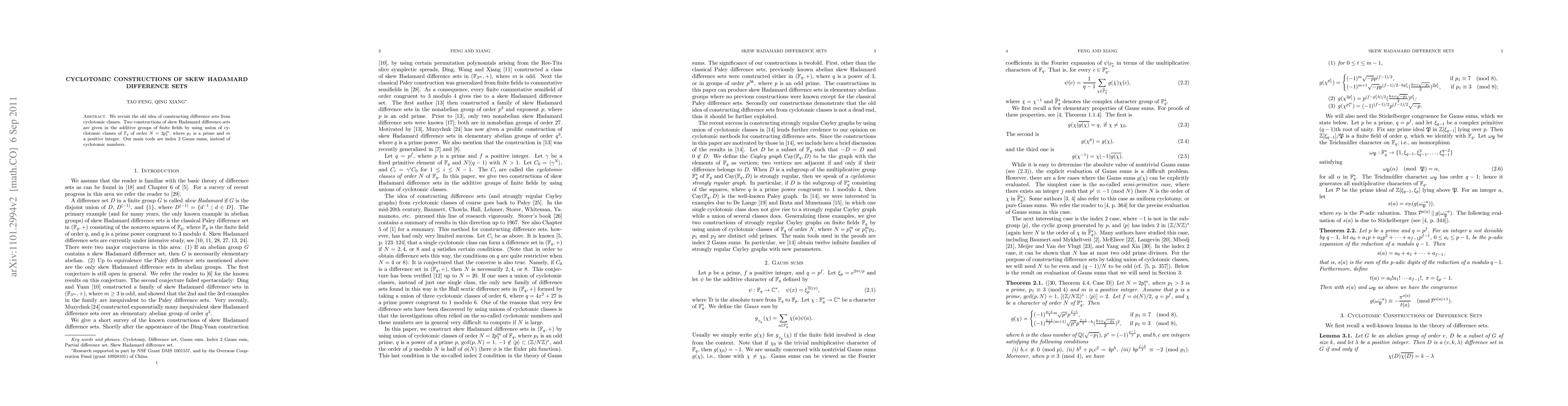 We revisit the old idea of constructing difference sets from cyclotomic classes. Two constructions of skew Hadamard difference sets are given in the additive groups of finite fields using unions of cyclotomic classes of order $N=2p_1^m$, where $p_1$ is a prime and $m$ a positive integer. Our main tools are index 2 Gauss sums, instead of cyclotomic numbers.