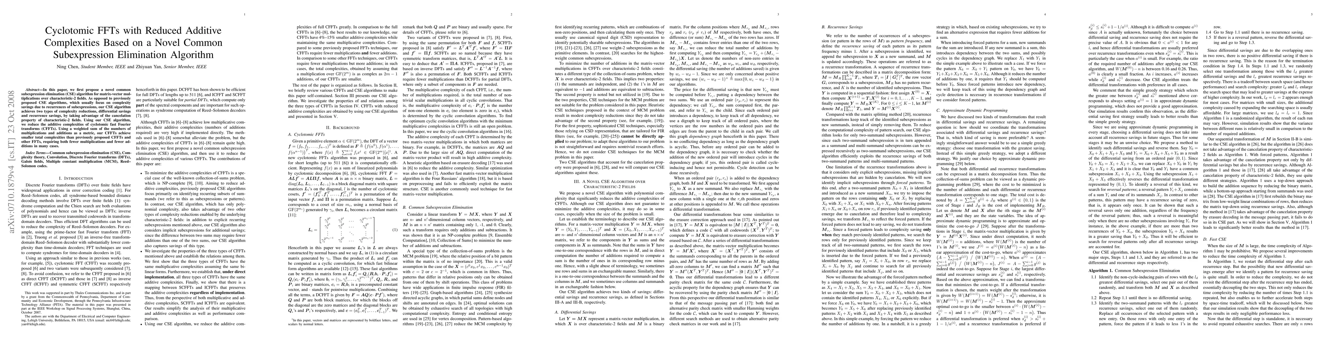 In this paper, we first propose a novel common subexpression elimination (CSE) algorithm for matrix-vector multiplications over characteristic-2 fields. As opposed to previously proposed CSE algorithms, which usually focus on complexity savings due to recurrences of subexpressions, our CSE algorithm achieves two types of complexity reductions, differential savings and recurrence savings, by taking advantage of the cancelation property of characteristic-2 fields. Using our CSE algorithm, we reduce the additive complexities of cyclotomic fast Fourier transforms (CFFTs). Using a weighted sum of the numbers of multiplications and additions as a metric, our CFFTs achieve smaller total complexities than previously proposed CFFTs and other FFTs, requiring both fewer multiplications and fewer additions in many cases.