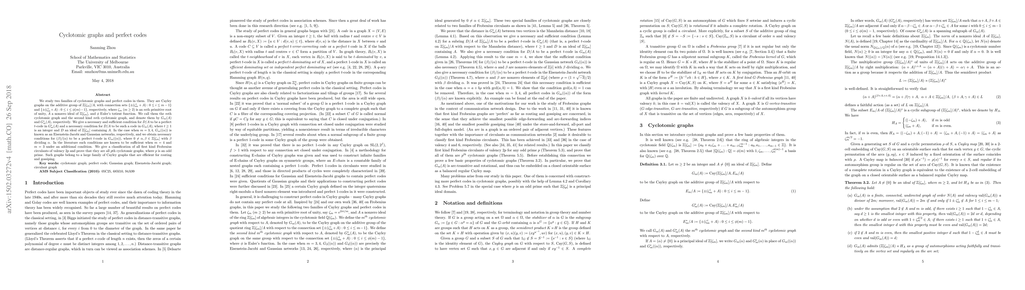 We study two families of cyclotomic graphs and perfect codes in them. They are Cayley graphs on the additive group of $\mathbb{Z}[\zeta_m]/A$, with connection sets $\{\pm (\zeta_m^i + A): 0 \le i \le m-1\}$ and $\{\pm (\zeta_m^i + A): 0 \le i \le \phi(m) - 1\}$, respectively, where $\zeta_m$ ($m \ge 2$) is an $m$th primitive root of unity, $A$ a nonzero ideal of $\mathbb{Z}[\zeta_m]$, and $\phi$ Euler's totient function. We call them the $m$th cyclotomic graph and the second kind $m$th cyclotomic graph, and denote them by $G_{m}(A)$ and $G^*_{m}(A)$, respectively. We give a necessary and sufficient condition for $D/A$ to be a perfect $t$-code in $G^*_{m}(A)$ and a necessary condition for $D/A$ to be such a code in $G_{m}(A)$, where $t \ge 1$ is an integer and $D$ an ideal of $\mathbb{Z}[\zeta_m]$ containing $A$. In the case when $m = 3, 4$, $G_m((\alpha))$ is known as an Eisenstein-Jacobi and Gaussian networks, respectively, and we obtain necessary conditions for $(\beta)/(\alpha)$ to be a perfect $t$-code in $G_m((\alpha))$, where $0 \ne \alpha, \beta \in \mathbb{Z}[\zeta_m]$ with $\beta$ dividing $\alpha$. In the literature such conditions are known to be sufficient when $m=4$ and $m=3$ under an additional condition. We give a classification of all first kind Frobenius circulants of valency $2p$ and prove that they are all $p$th cyclotomic graphs, where $p$ is an odd prime. Such graphs belong to a large family of Cayley graphs that are efficient for routing and gossiping.