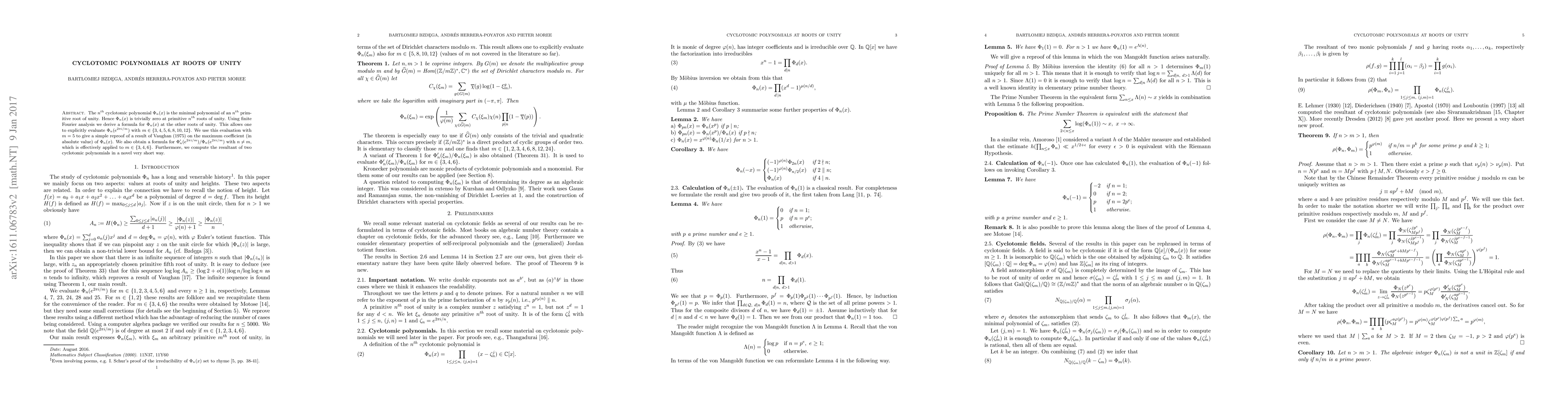 The $n^{th}$ cyclotomic polynomial $\Phi_n(x)$ is the minimal polynomial of an $n^{th}$ primitive root of unity. Hence $\Phi_n(x)$ is trivially zero at primitive $n^{th}$ roots of unity. Using finite Fourier analysis we derive a formula for $\Phi_n(x)$ at the other roots of unity. This allows one to explicitly evaluate $\Phi_n(e^{2\pi i/m})$ with $m\in \{3,4,5,6,8,10,12\}$. We use this evaluation with $m=5$ to give a simple reproof of a result of Vaughan (1975) on the maximum coefficient (in absolute value) of $\Phi_n(x)$. We also obtain a formula for $\Phi_n'(e^{2\pi i/m}) / \Phi_n(e^{2\pi i/m})$ with $n \ne m$, which is effectively applied to $m \in \{3,4,6\}$. Furthermore, we compute the resultant of two cyclotomic polynomials in a novel very short way.