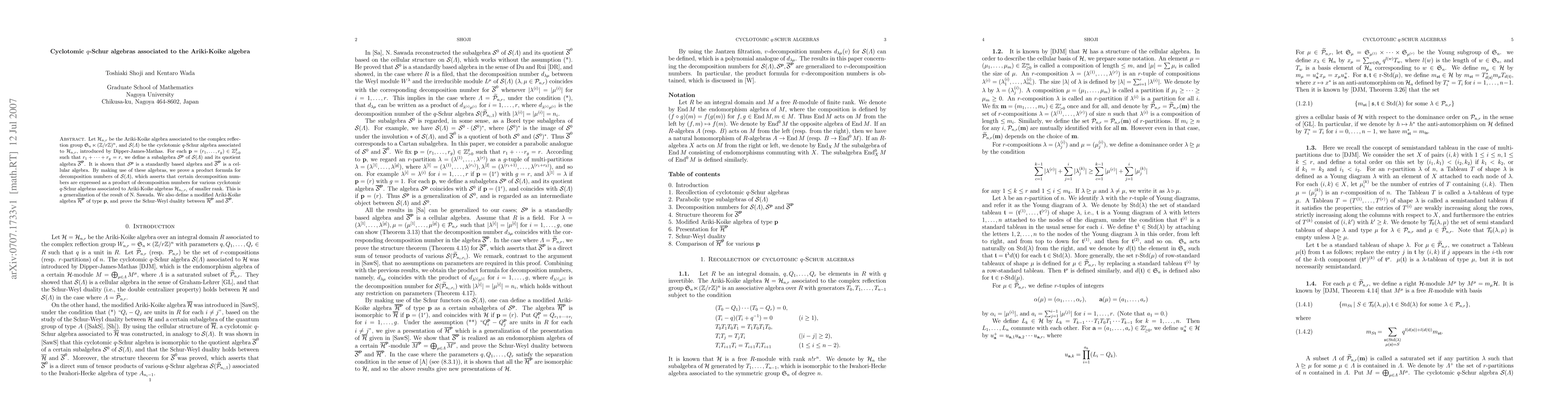 Summary: The paper defines subalgebras $S^p$ and their quotients $\bar S^p$ within the cyclotomic $q$-Schur algebra $S$ associated with the Ariki-Koike algebra $H_{n,r}$. It proves that $S^p$ is a standardly based algebra and $\bar S^p$ is a cellular algebra, and shows that certain decomposition numbers for $S$ can be expressed as products of decomposition numbers for smaller associated cyclotomic $q$-Schur algebras.