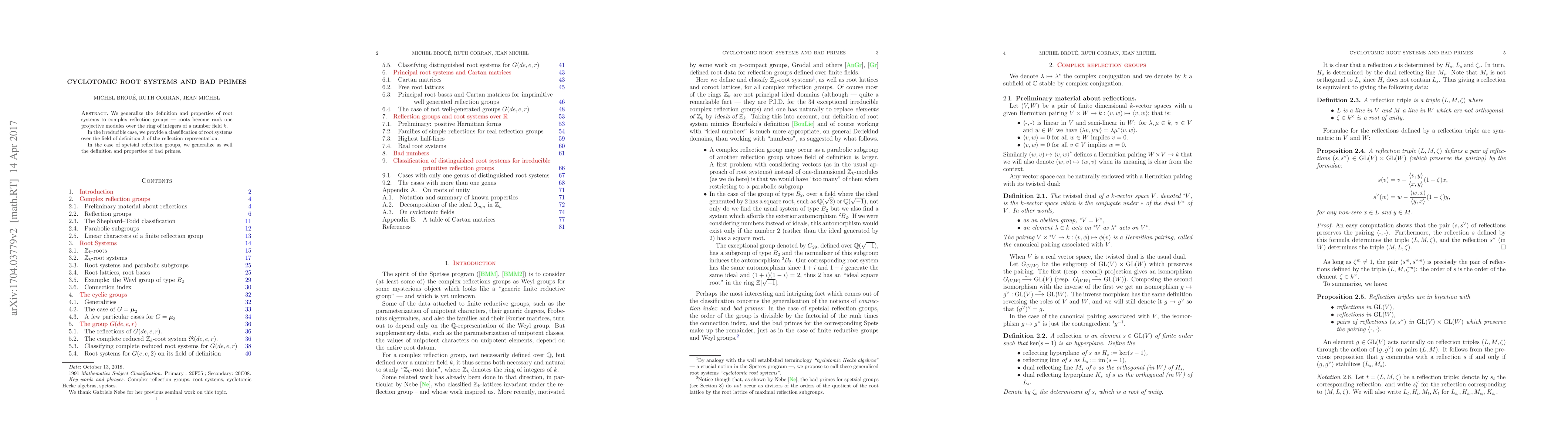 We generalize the definition and properties of root systems to complex reflection groups - roots become rank one projective modules over the ring of integers of a number field k. In the irreducible case, we provide a classification of root systems over the field of definition k of the reflection representation. In the case of spetsial reflection groups, we generalize as well the definition and properties of bad primes.