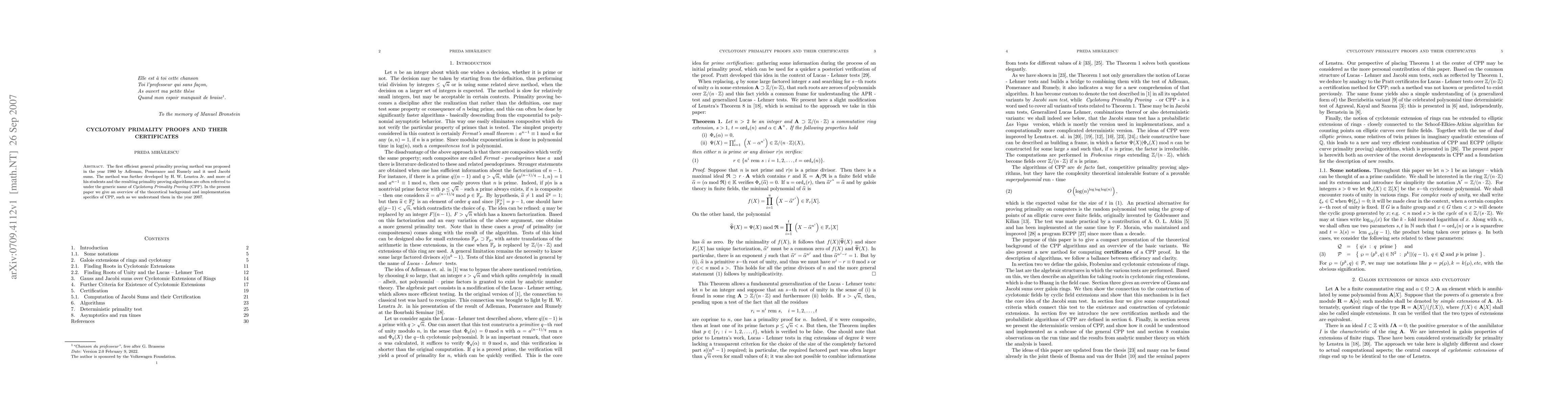 This paper provides an overview of Cyclotomy Primality Proving (CPP) methods, which were developed in the 1980s and refined by Lenstra and his students, focusing on their theoretical background and practical implementation details as of 2007.