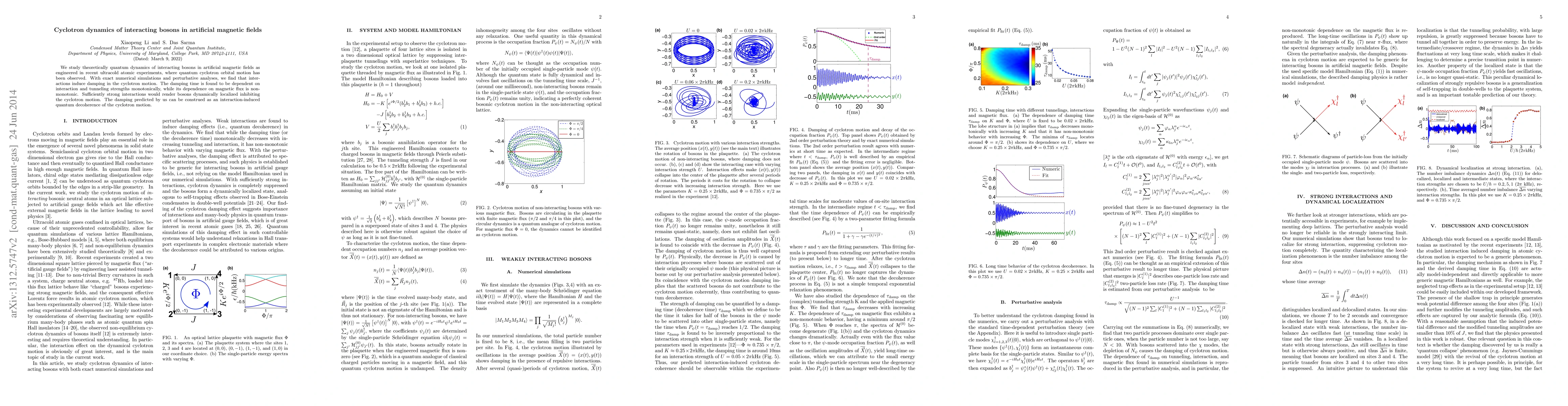 This paper investigates the quantum dynamics of interacting bosons in artificial magnetic fields, revealing that interactions cause damping in cyclotron motion, with damping time dependent on interaction and tunneling strengths. Strong interactions can lead to dynamic localization, inhibiting cyclotron motion and inducing quantum decoherence.