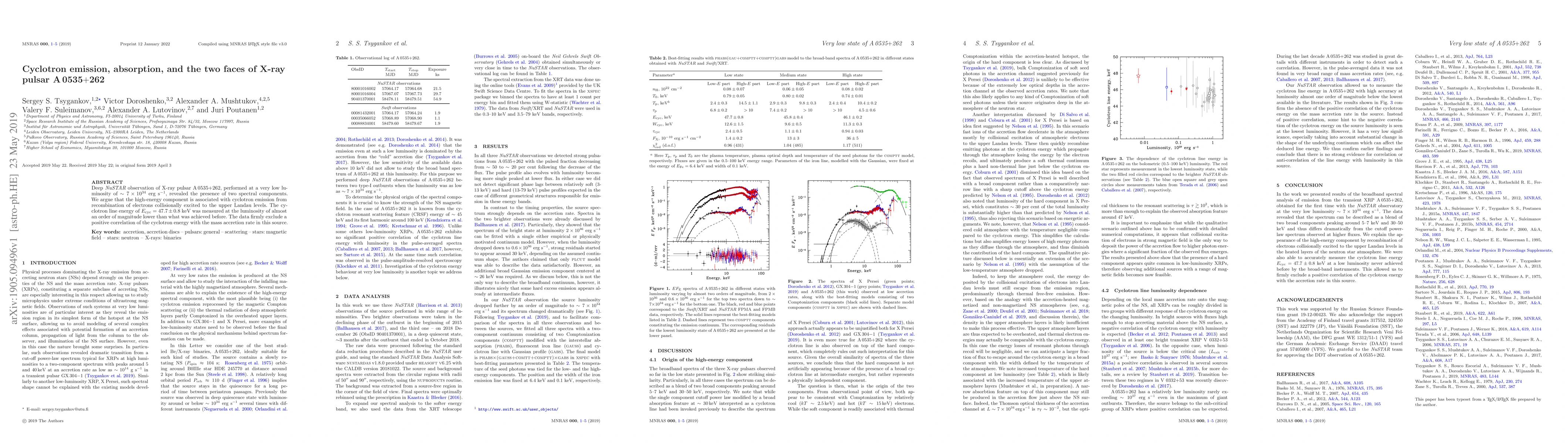Deep NuSTAR observation of X-ray pulsar A 0535+262, performed at a very low luminosity of $\sim7\times10^{34}$ erg s$^{-1}$, revealed the presence of two spectral components. We argue that the high-energy component is associated with cyclotron emission from recombination of electrons collisionally excited to the upper Landau levels. The cyclotron line energy of $E_{\rm cyc}=47.7\pm0.8$ keV was measured at the luminosity of almost an order of magnitude lower than what was achieved before. The data firmly exclude a positive correlation of the cyclotron energy with the mass accretion rate in this source.
