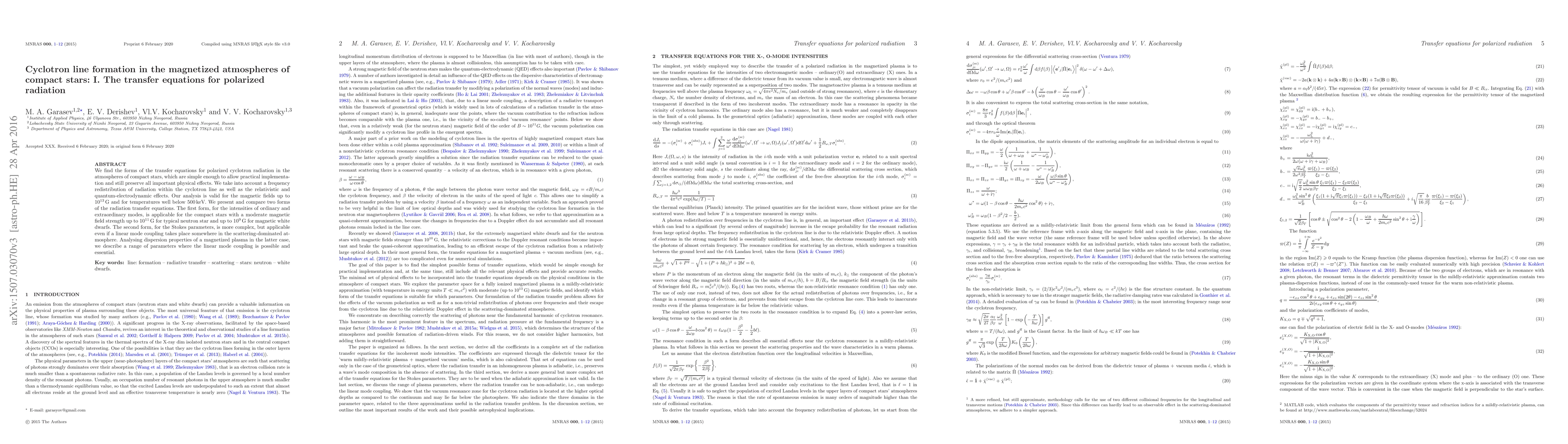 We find the forms of the transfer equations for polarized cyclotron radiation in the atmospheres of compact stars, which are simple enough to allow practical implementation and still preserve all important physical effects. We take into account a frequency redistribution of radiation within the cyclotron line as well as the relativistic and quantum-electrodynamic effects. Our analysis is valid for the magnetic fields up to $10^{13}$G and for temperatures well below 500keV.} We present and compare two forms of the radiation transfer equations. The first form, for the intensities of ordinary and extraordinary modes, is applicable for the compact stars with a moderate magnetic field strength up to $10^{11}$G for typical neutron star and up to $10^9$G for magnetic white dwarfs. The second form, for the Stokes parameters, is more complex, but applicable even if a linear mode coupling takes place somewhere in the scattering-dominated atmosphere. Analysing dispersion properties of a magnetized plasma {in the latter case, we describe a range of parameters where the linear mode coupling is possible and essential.