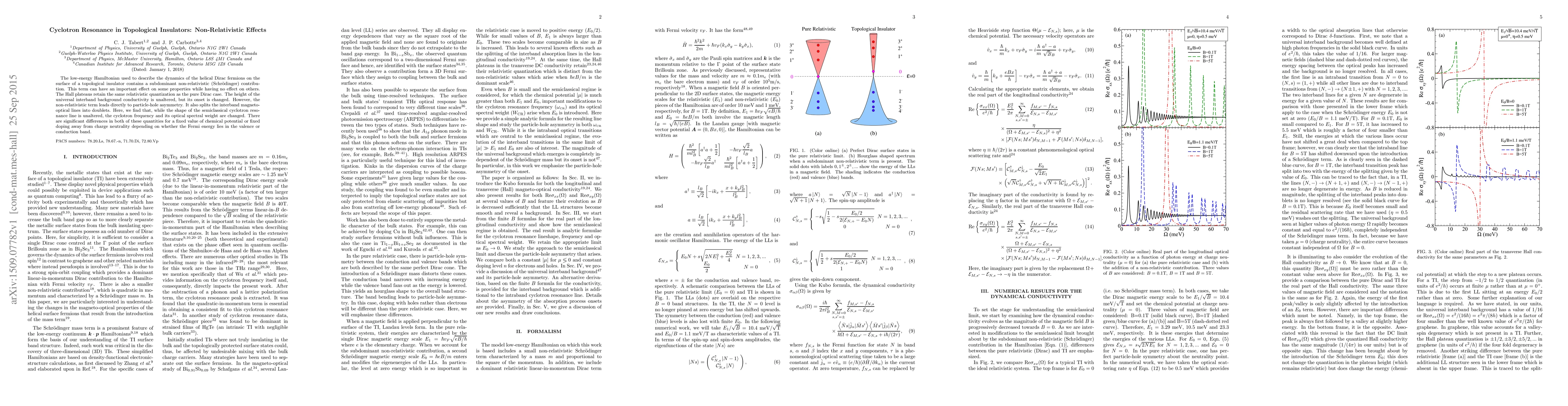 Research on topological insulators reveals that a non-relativistic term in their low-energy Hamiltonian affects certain properties, including cyclotron frequency and optical spectral weight, depending on whether the Fermi energy is in the valence or conduction band.