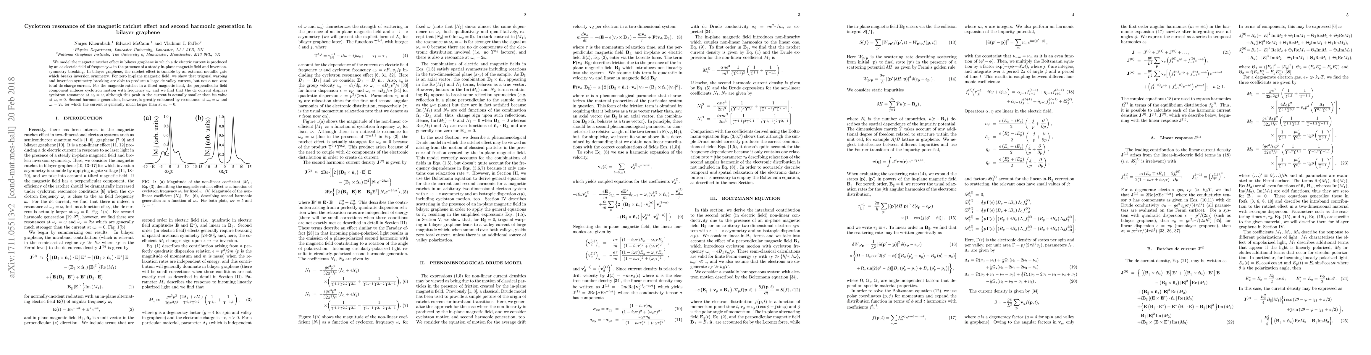 This paper models the magnetic ratchet effect in bilayer graphene, showing cyclotron resonance at the cyclotron frequency in the presence of a magnetic field. It highlights that while the dc current peak at resonance is smaller than at zero magnetic field, second harmonic generation is significantly enhanced at these frequencies.