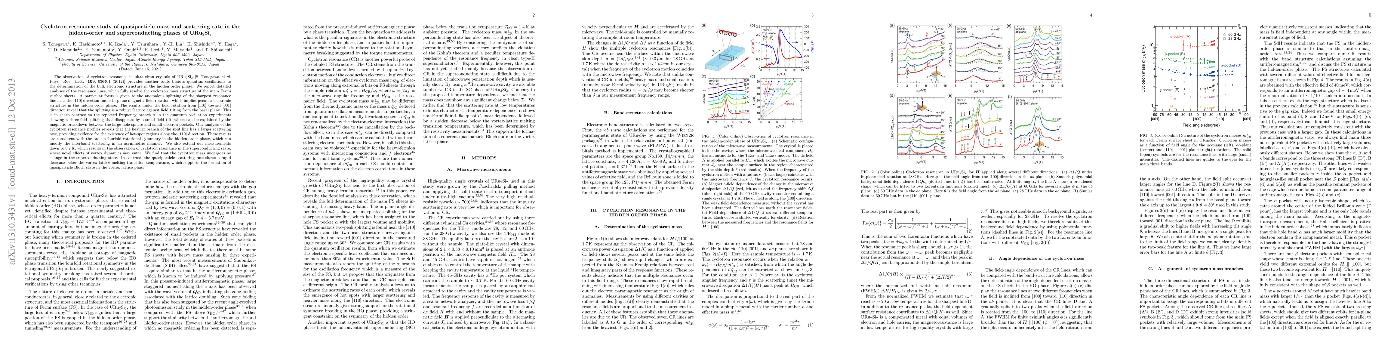 This study investigates cyclotron resonance in URu2Si2, revealing details about quasiparticle mass and scattering rate in its hidden-order and superconducting phases, with key findings including anomalous splitting of resonance lines and evidence for hot-spot regions.