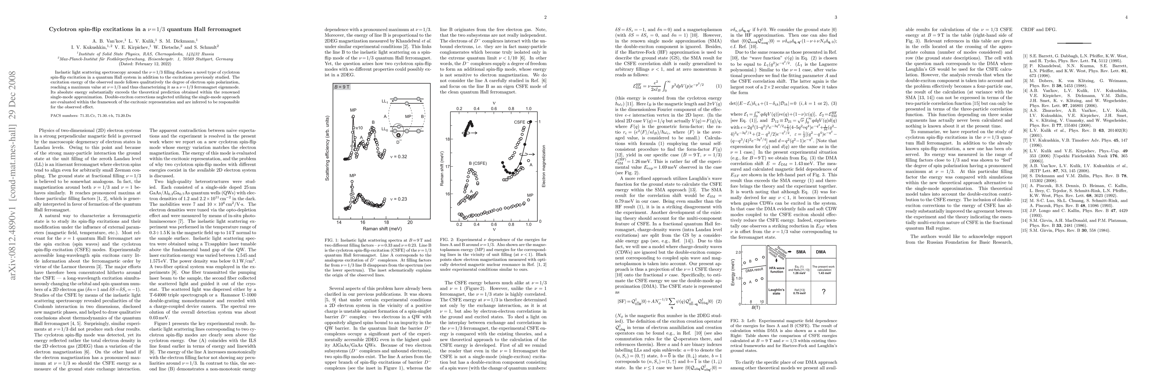 This paper reports novel cyclotron spin-flip excitations observed in a \nu=1/3 quantum Hall ferromagnet through inelastic light scattering. The excitation energy peaks at \nu=1/3, surpassing theoretical predictions and implicating double-exciton corrections.