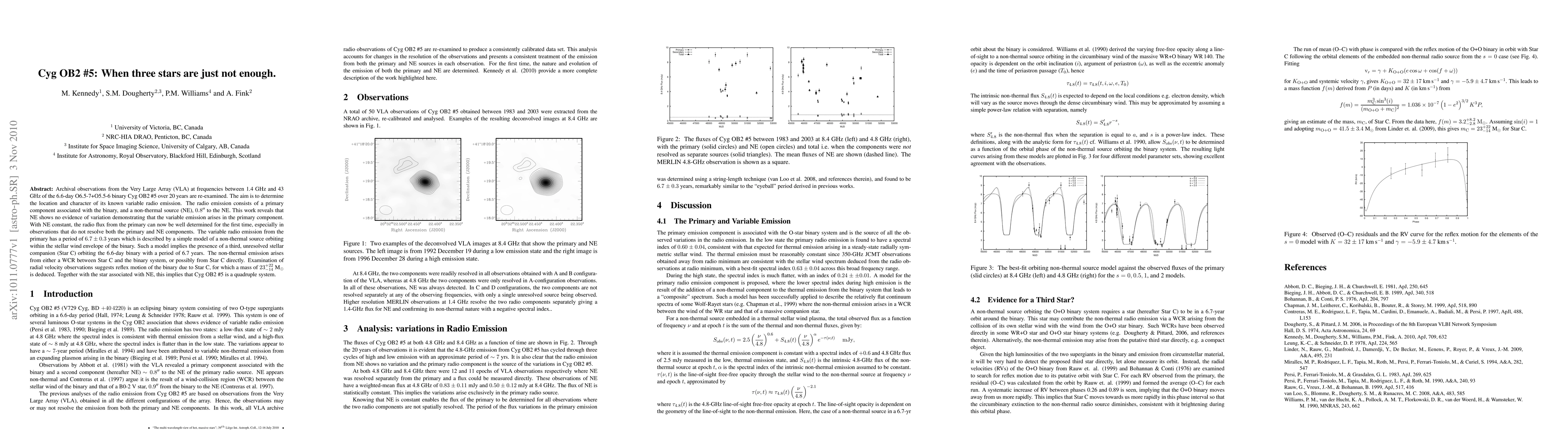 Astronomers have discovered a fourth star in the Cyg OB2 #5 system, resolving its variable radio emission, which is now attributed to the primary component with a 6.7-year period. This finding reveals Cyg OB2 #5 as a quadruple system.