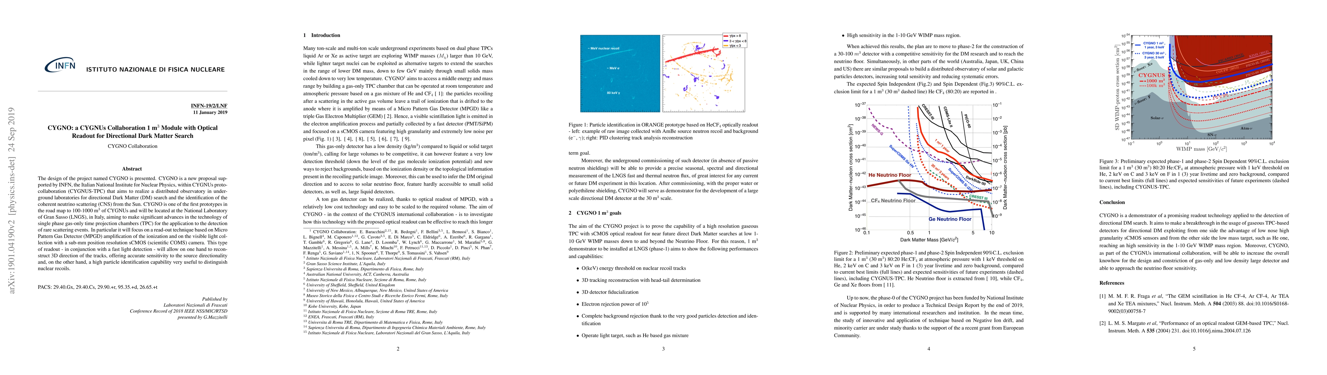 The design of the project named CYGNO is presented. CYGNO is a new proposal supported by INFN, the Italian National Institute for Nuclear Physics, within CYGNUs proto-collaboration (CYGNUS-TPC) that aims to realize a distributed observatory in underground laboratories for directional Dark Matter (DM) search and the identification of the coherent neutrino scattering (CNS) from the Sun. CYGNO is one of the first prototypes in the road map to 100-1000 m^3 of CYGNUs and will be located at the National Laboratory of Gran Sasso (LNGS), in Italy, aiming to make significant advances in the technology of single phase gas-only time projection chambers (TPC) for the application to the detection of rare scattering events. In particular it will focus on a read-out technique based on Micro Pattern Gas Detector (MPGD) amplification of the ionization and on the visible light collection with a sub-mm position resolution sCMOS (scientific COMS) camera. This type of readout - in conjunction with a fast light detection - will allow on one hand to reconstruct 3D direction of the tracks, offering accurate sensitivity to the source directionality and, on the other hand, a high particle identification capability very useful to distinguish nuclear recoils.