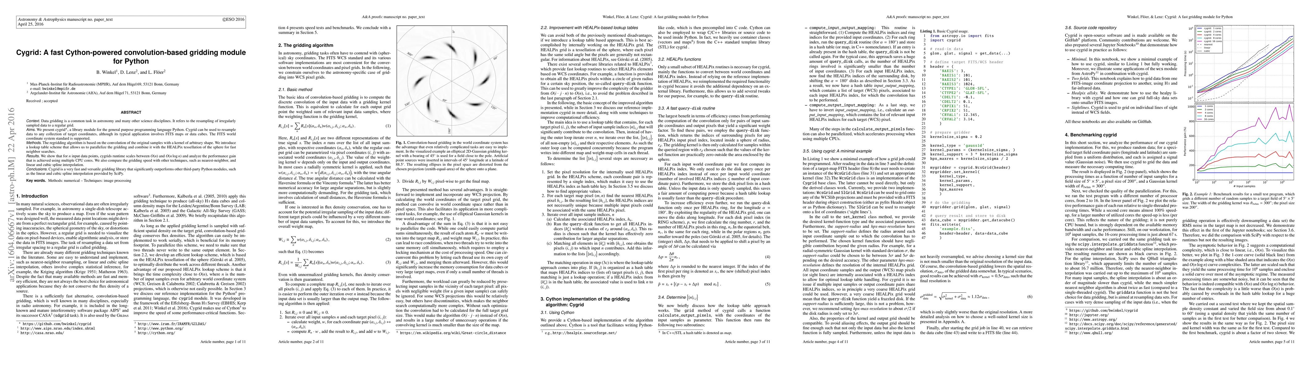 Cygrid is a Cython-powered convolution-based gridding module for Python that efficiently resamples irregularly sampled data to a regular grid, significantly outperforming other methods like linear and cubic spline interpolation. It leverages parallelization and HEALPix tessellation for fast neighbor searches, achieving runtime scaling between O(n) and O(n log n).