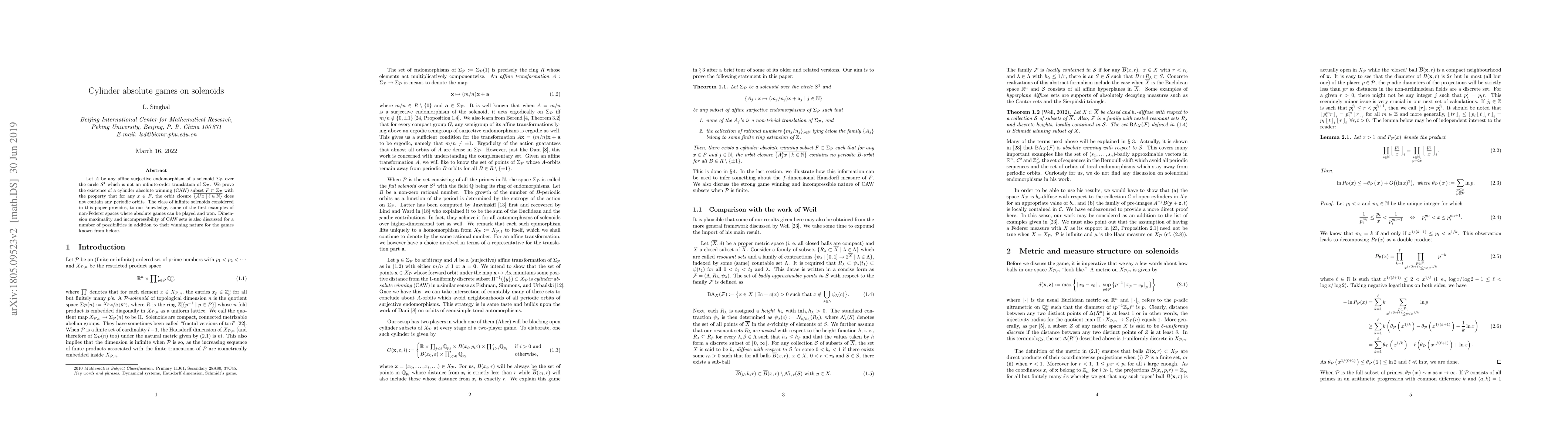 Let $A$ be any affine surjective endomorphism of a solenoid $\Sigma_{\mathcal{P}}$ over the circle $S^1$ which is not an infinite-order translation of $\Sigma_{\mathcal{P}}$. We prove the existence of a cylinder absolute winning (CAW) subset $F \subset \Sigma_{\mathcal{P}}$ with the property that for any $x \in F$, the orbit closure $\overline{\{ A^{\ell} x \mid \ell \in \mathbb{N} \}}$ does not contain any periodic orbits. The class of infinite solenoids considered in this paper provides, to our knowledge, some of the first examples of non-Federer spaces where absolute games can be played and won. Dimension maximality and incompressibility of CAW sets is also discussed for a number of possibilities in addition to their winning nature for the games known from before.