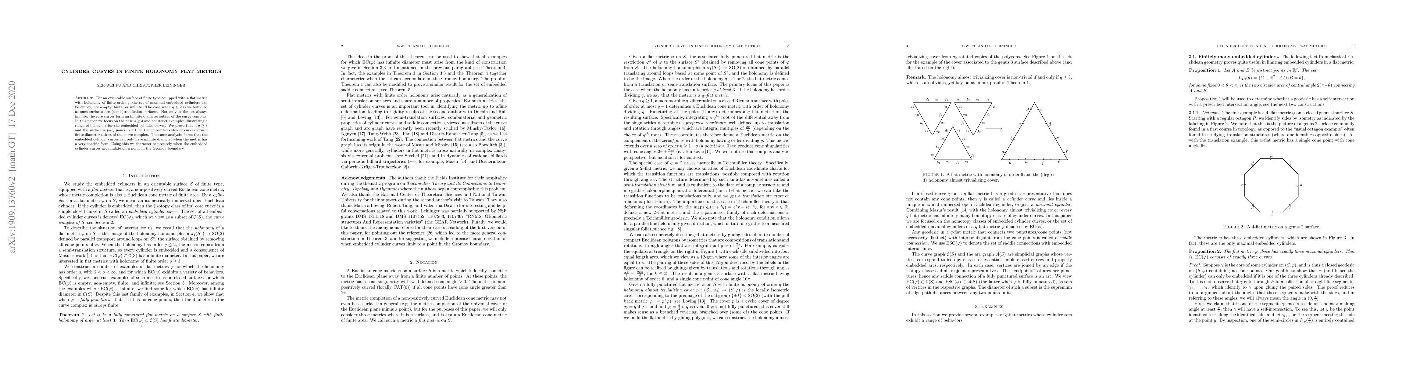 Researchers investigated cylinder curves in flat metrics with finite holonomy, finding that for fully punctured surfaces, embedded cylinders form a finite diameter subset of the curve complex, while infinite diameter occurs under specific metric conditions.
