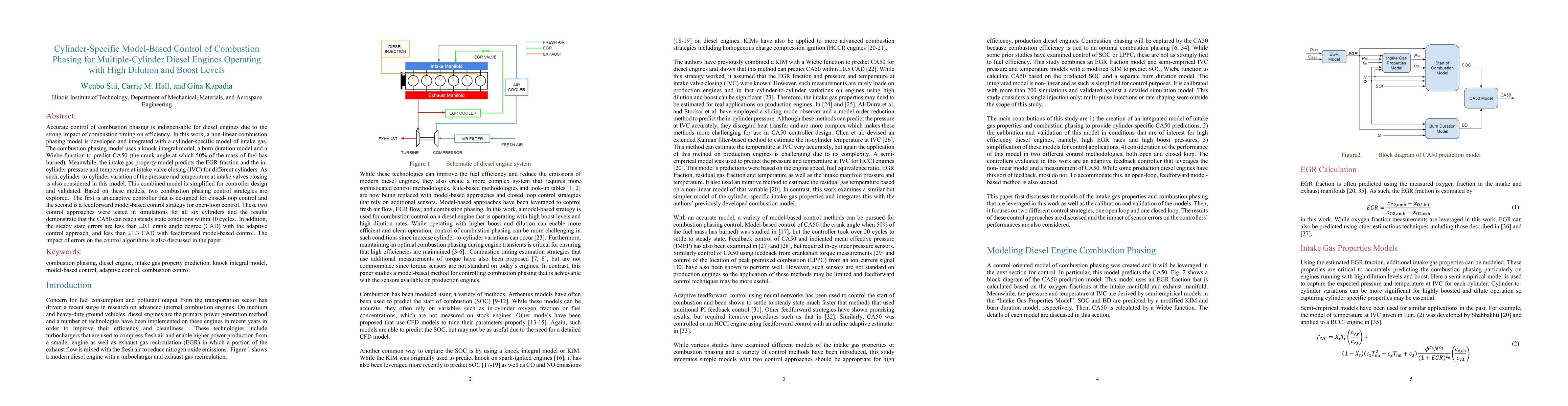 This paper develops a non-linear model for cylinder-specific combustion phasing control in diesel engines, integrating a combustion phasing model with a cylinder-specific intake gas property model. Two control strategies—adaptive and feedforward—are tested, showing CA50 can reach steady state within 10 cycles, with adaptive control achieving errors less than +/-0.1 CAD and feedforward control less than +/-1.3 CAD.