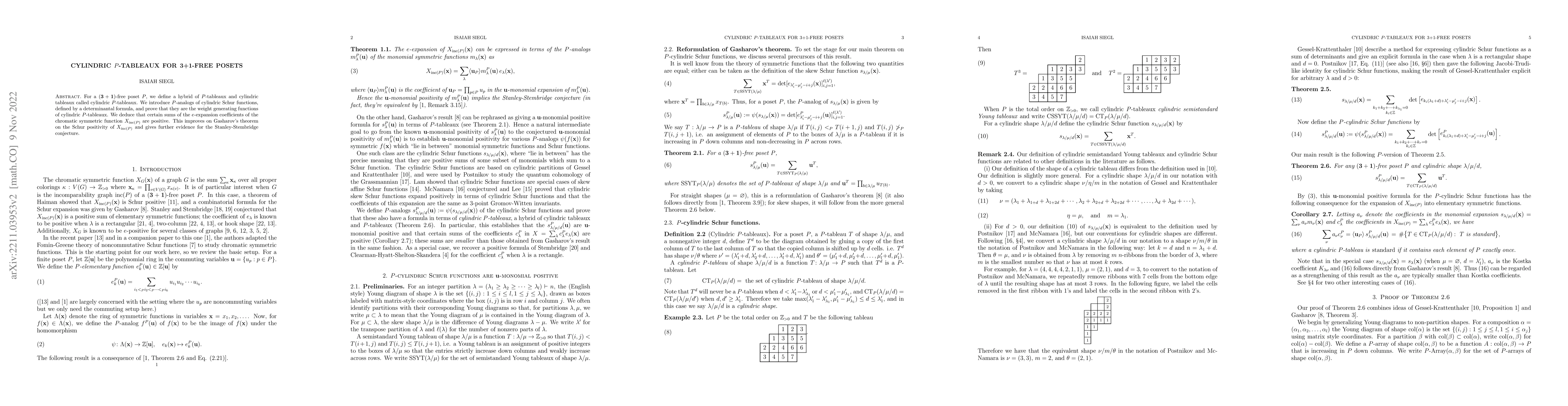 This paper introduces cylindric $P$-tableaux for $(3+1)$-free posets, defining $P$-analogs of cylindric Schur functions via a determinantal formula. It proves these functions are weight generating for cylindric $P$-tableaux and demonstrates Schur positivity for sums of $e$-expansion coefficients of the chromatic symmetric function $X_{inc(P)}$, enhancing Gasharov's theorem and supporting the Stanley-Stembridge conjecture.
