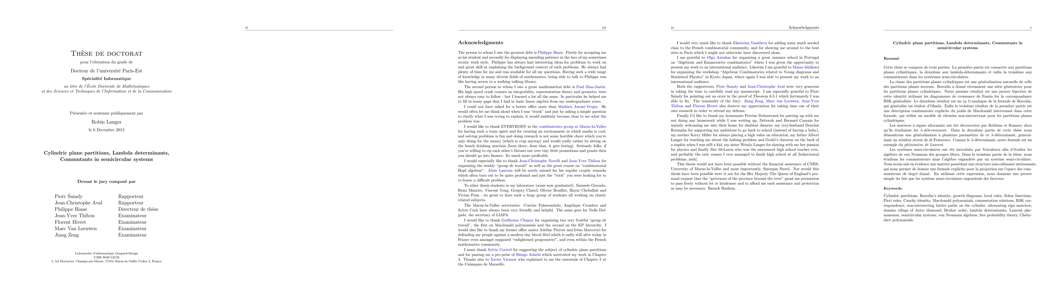 This thesis is divided into three parts. The first part deals with cylindric plane partitions. The second with lambda-determinants and the third with commutators in semi-circular systems. For more detailed abstract please see inside. Cylindric plane partitions may be thought of as a natural generalization of reverse plane partitions. A generating series for the enumeration of cylindric plane partitions was recently given by Borodin. The first result of section one is a new bijective proof of Borodin's identity which makes use of Fomin's growth diagram framework for generalized RSK correspondences. The second result is a $(q,t)$-analog of Borodin's identity which extends previous work by Okada in the reverse plane partition case. The third result is an explicit combinatorial interpretation of the Macdonald weight occurring in the $(q,t)$-analog using the non-intersecting lattice path model for cylindric plane partitions. Alternating sign matrices were discovered by Robbins and Rumsey whilst studying \emph{$\lambda$-determinants}. In the second part of this thesis we prove a multi-parameter generalization of the $\lambda$-determinant, generalizing a recent result by di Francesco. Like the original $\lambda$-determinant, our formula exhibits the \emph{Laurent phenomenon}. Semicircular systems were first introduced by Voiculescu as a part of his study of von Neumann algebras. In the third part of this thesis we study certain commutator subalgebras of the semicircular system. We find a projection matrix with an interesting self-similar structure. Making use of our projection formula we given an alternative, elementary proof that the semicircular system is a factor.