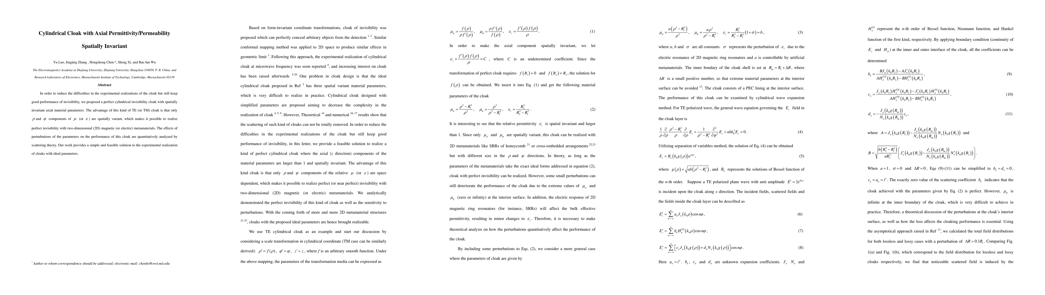 This paper proposes a perfect cylindrical cloak with spatially invariant axial permittivity and permeability, simplifying experimental realization while maintaining invisibility performance. The cloak's design allows for perfect invisibility using 2D magnetic or electric metamaterials, and its robustness against parameter perturbations is analyzed using scattering theory.