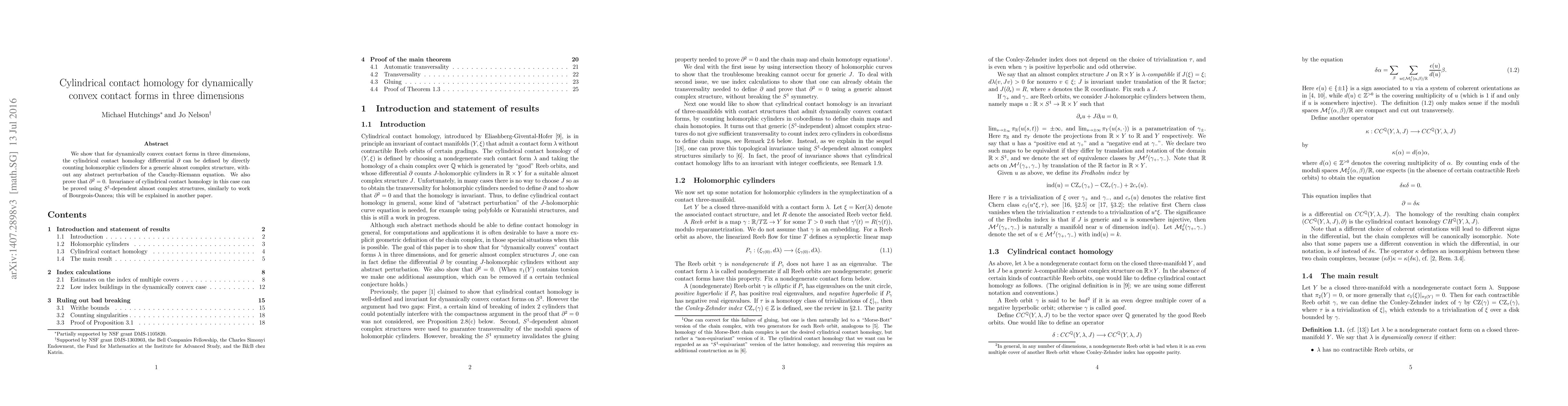 This research defines cylindrical contact homology for dynamically convex contact forms in three dimensions via holomorphic cylinder counts under a generic almost complex structure, proving that the differential satisfies d^2 = 0. Invariance will be further detailed in a subsequent paper, employing S^1-dependent almost complex structures.